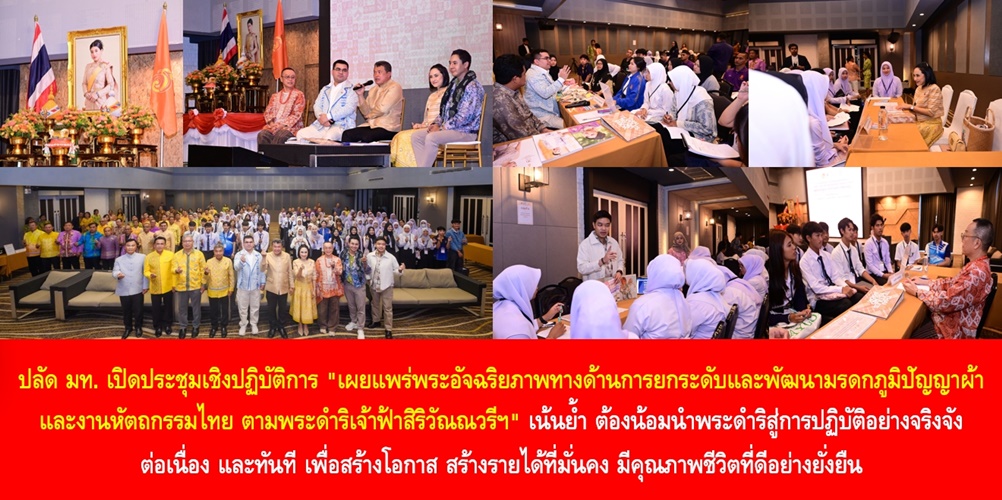 “การประชุมเชิงปฏิบัติการฯ ในวันนี้ จะทำให้ผู้ร่วมทุกคนตระหนักถึง 1. แนวพระดำริ ที่จะเป็นประโยชน์ต่อการนำไปจินตนาการต่อยอดการพัฒนางานผ้าและงานหัตถกรรมให้เพิ่มมากขึ้น 2. ทำให้เราเกิดแรงบันดาลใจช่วยทำให้ภูมิปัญญาผ้าไทยกับงานหัตถกรรมไทยมีชีวิตที่ยืนยาว ด้วยการที่คนในสังคมให้การยอมรับและนำไปใช้ในชีวิตประจำวัน อันส่งผลให้ต้นน้ำ (ภาคการผลิต) ได้มีกำลังในการออกแบบตัดเย็บและเพิ่มกำลังการผลิตด้วยการหาสมาชิกใหม่เพิ่มเติมเพื่อสืบสาน รักษา และต่อยอด เพิ่มมากขึ้น รวมทั้งยังทำให้เกิดกลุ่มใหม่เพิ่มมากขึ้น ซึ่งปัจจัยสำคัญของความยั่งยืนในการสืบสาน รักษา และต่อยอด ของงานผ้าไทยและหัตถศิลป์หัตถกรรมไทย คือ มีคนใช้ คนซื้อ มีรายได้จุนเจือครอบครัว 3. เรียนรู้และเผยแพร่หนังสือ Thai Textiles Trend Book ที่นำเสนอ 4 กลุ่มสี คือ โอบอ้อมอบอุ่น สวรรค์เขตร้อน เงาแห่งอดีต และแพรวพราววาวฝัน (อ่าน E-book ที่ https://online.fliphtml5.com/rnqjs/tmaz/#p=2) จึงมีการแบ่งกลุ่มฝึกปฏิบัติ 6 กลุ่ม ได้แก่ 1 การสร้างแบรนด์ให้กับผลิตภัณฑ์ผ้าและงานหัตถกรรมไทยสู่ตลาดสากล 2 การต่อยอดผลิตภัณฑ์ผ้าและงานหัตถกรรมไทยตามเทรนด์แฟชั่นที่ร่วมสมัย 3 การพัฒนานาบรรจุภัณฑ์ให้ตรงกับความต้องการของตลาด 4 การผลิตเส้นใยและการย้อมสีธรรมชาติที่เป็นมิตรต่อสิ่งแวดล้อม (BCG) 5 กลยุทธ์ทางการตลาดและการจำหน่ายผลิตภัณฑ์สินค้าตามคอนเทนต์ออนไลน์ และ 6 เทคนิคการจับคู่สีตามหนังสือ Thai Textile Trend Book” นายสุทธิพงษ์ กล่าวเพิ่มเติม