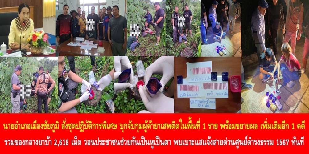 ภายหลังจากการจับกุม อำเภอเมืองชัยภูมิ ได้ดำเนินการขยายผลจากกรณีดังกล่าว เจ้าหน้าที่ฝ่ายปกครอง ร่วมกับเจ้าหน้าที่ตำรวจได้สืบสวนสอบสวนเเละขยายผลต่อเนื่อง โดยทราบข้อมูลว่า นายเสกสรรค์ รับยาเสพติดมาจากนาย ชล ที่อยู่อำเภอคอนสวรรค์ โดยสั่งมาที่ละ 5 ถุง (1,000 เม็ด) ราคา 17,000 บาท ชุดสืบสวน สภ.เมืองชัยภูมิ จึงได้ขยายผลและสามารถจับกุมนาย ชล พร้อม ภรรยาได้ ขณะกำลังนำยาเสพติดมากระจายให้กับพ่อค้ายาเสพติดในพื้นที่ โดยได้ทำการตรวจยึดยาบ้า จำนวน 10 ถุง หรือประมาณ 2,019 เม็ด โดยขณะนี้ได้นำตัวนายชล และภรรยาดำเนินคดีตามกฎหมายแล้ว