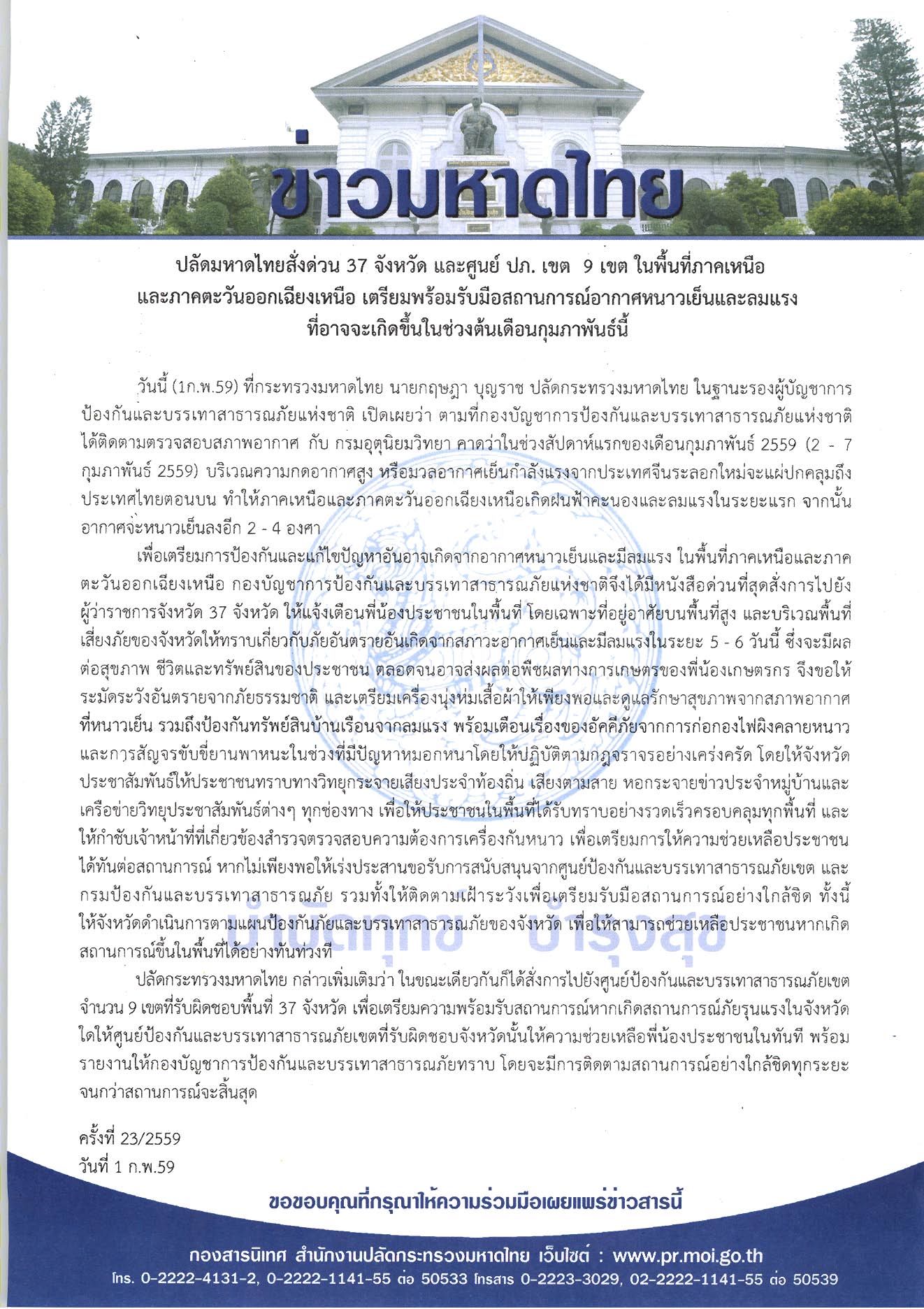ข่าวมหาดไทย ปลัดมหาดไทยสั่งด่วน 37 จังหวัด และศูนย์ ปภ. เขต 9 เขต ในพื้นที่ภาคเหนือ และภาคตะวันออกเฉียงเหนือ เตรียมพร้อมรับมือสถานการณ์อากาศหนาวเย็นและลมแรง ที่อาจจะเกิดขึ้นในช่วงต้นเดือนกุมภาพันธ์นี้ โดย กองสารนิเทศ สำนักงานปลัดกระทรวงมหาดไทย 2 กุมภาพันธ์ 2016 2 กุมภาพันธ์ 2016 9 ยอดวิว ก่อนหน้า มหาดไทยสั่งทุกจังหวัดเร่งดำเนินโครงการตามมาตรการตำบลละ 5 ล้าน พร้อมจัดทีมช่วยเหลือและสนับสนุนการทำงาน ถัดไป มหาดไทยจับมือ ทุกหน่วยงาน – องค์กรที่เกี่ยวข้องเดินหน้าป้องกันและแก้ไขปัญหาไฟป่าและหมอกควัน ย้ำให้ผู้ว่าราชการจังหวัดทำหน้าที่บูรณาการเชิงพื้นที่เพื่อป้องกันปัญหาอย่างเต็มที่ บทความที่เกี่ยวข้อง “มหาดไทย” ยกระดับเพิ่มประสิทธิภาพการตร... 15 ธันวาคม 2025 “รมช.มท.ก้อย-ศศิธร” แถลงข่าวมหกรรมของข... 15 ธันวาคม 2025 “อรรษิษฐ์ สัมพันธรัตน์” ปลัด มท. ประกา... 15 ธันวาคม 2025 สมเด็จพระกนิษฐาธิราชเจ้า กรมสมเด็จพระเทพรัตนราชสุด... 15 ธันวาคม 2025 มท.4 “ศศิธร” ลงพื้นที่ จ.เชียงใหม่ เปิ... 14 ธันวาคม 2025 “รมช.มท.ศักดิ์ดา” แถลง “ปิดกองบัญชาการ ปภ.ชาติ ส่ว... 14 ธันวาคม 2025 ผู้บัญชาการกองอาสารักษาดินแดน ขอบคุณและชื่นชมความเ... 13 ธันวาคม 2025 “รมช.มหาดไทย ศศิธร” เป็นประธานประชุมรัฐมนตรีอาเซีย... 13 ธันวาคม 2025 คกก.นโยบายลดอุบัติเหตุทางถนนแห่งชาติ เห็นชอบขับเคล... 12 ธันวาคม 2025
