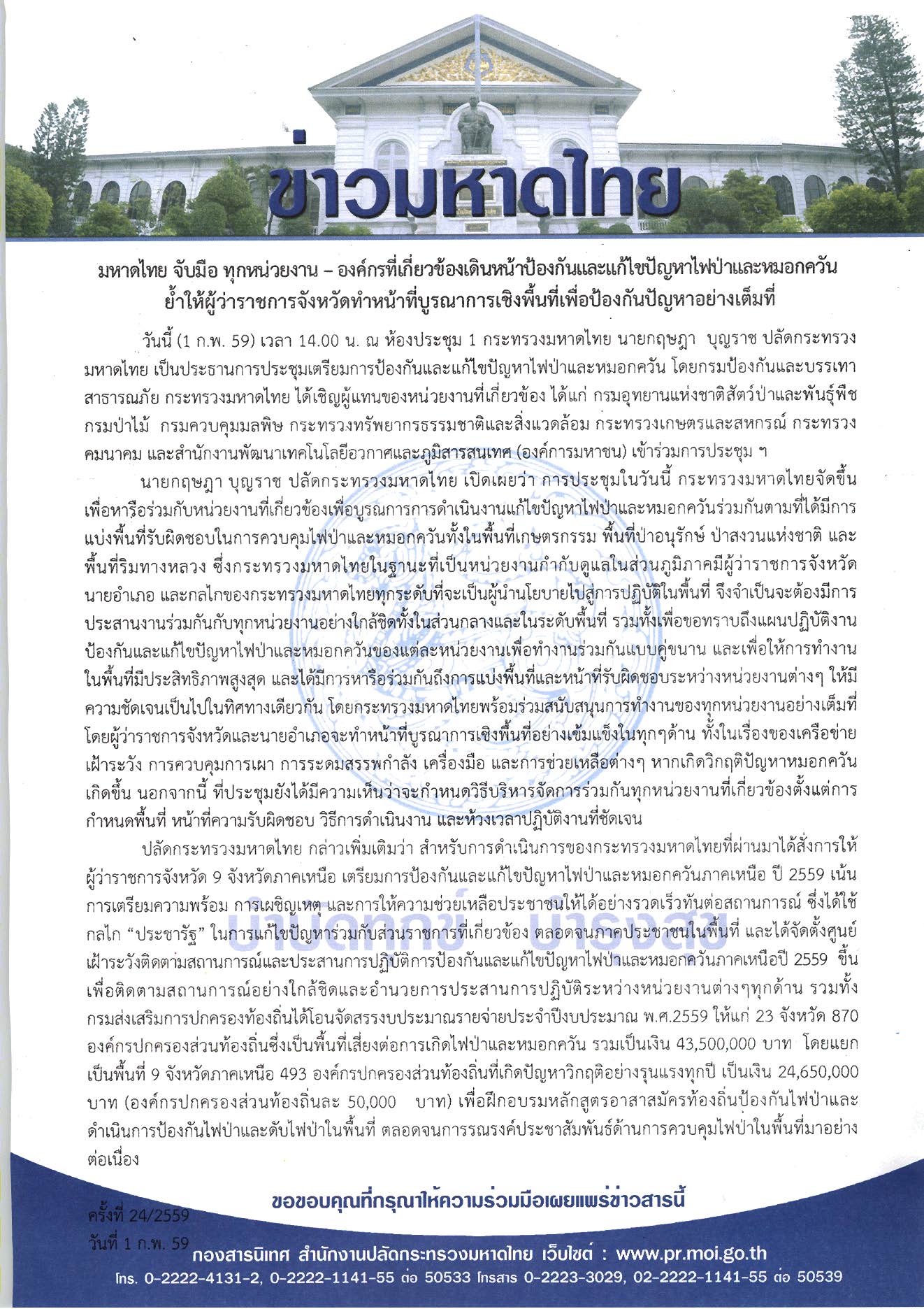 ข่าวมหาดไทย มหาดไทยจับมือ ทุกหน่วยงาน – องค์กรที่เกี่ยวข้องเดินหน้าป้องกันและแก้ไขปัญหาไฟป่าและหมอกควัน ย้ำให้ผู้ว่าราชการจังหวัดทำหน้าที่บูรณาการเชิงพื้นที่เพื่อป้องกันปัญหาอย่างเต็มที่ โดย กองสารนิเทศ สำนักงานปลัดกระทรวงมหาดไทย 2 กุมภาพันธ์ 2016 2 กุมภาพันธ์ 2016 10 ยอดวิว ก่อนหน้า ปลัดมหาดไทยสั่งด่วน 37 จังหวัด และศูนย์ ปภ. เขต 9 เขต ในพื้นที่ภาคเหนือ และภาคตะวันออกเฉียงเหนือ เตรียมพร้อมรับมือสถานการณ์อากาศหนาวเย็นและลมแรง ที่อาจจะเกิดขึ้นในช่วงต้นเดือนกุมภาพันธ์นี้ ถัดไป นายสุธี มากบุญ รัฐมนตรีช่วยว่าการกระทรวงมหาดไทย ลงพื้นที่จังหวัดนครสวรรค์ ติดตามความคืบหน้างานสำคัญตามนโยบายเร่งด่วนของรัฐบาลและกระทรวงมหาดไทย พร้อมมอบแนวทางการขับเคลื่อนงานในพื้นที่ ย้ำต้องทำงานร่วมกันในแบบ “ประชารัฐ” บทความที่เกี่ยวข้อง “มหาดไทย” ยกระดับเพิ่มประสิทธิภาพการตร... 15 ธันวาคม 2025 “รมช.มท.ก้อย-ศศิธร” แถลงข่าวมหกรรมของข... 15 ธันวาคม 2025 “อรรษิษฐ์ สัมพันธรัตน์” ปลัด มท. ประกา... 15 ธันวาคม 2025 สมเด็จพระกนิษฐาธิราชเจ้า กรมสมเด็จพระเทพรัตนราชสุด... 15 ธันวาคม 2025 มท.4 “ศศิธร” ลงพื้นที่ จ.เชียงใหม่ เปิ... 14 ธันวาคม 2025 “รมช.มท.ศักดิ์ดา” แถลง “ปิดกองบัญชาการ ปภ.ชาติ ส่ว... 14 ธันวาคม 2025 ผู้บัญชาการกองอาสารักษาดินแดน ขอบคุณและชื่นชมความเ... 13 ธันวาคม 2025 “รมช.มหาดไทย ศศิธร” เป็นประธานประชุมรัฐมนตรีอาเซีย... 13 ธันวาคม 2025 คกก.นโยบายลดอุบัติเหตุทางถนนแห่งชาติ เห็นชอบขับเคล... 12 ธันวาคม 2025