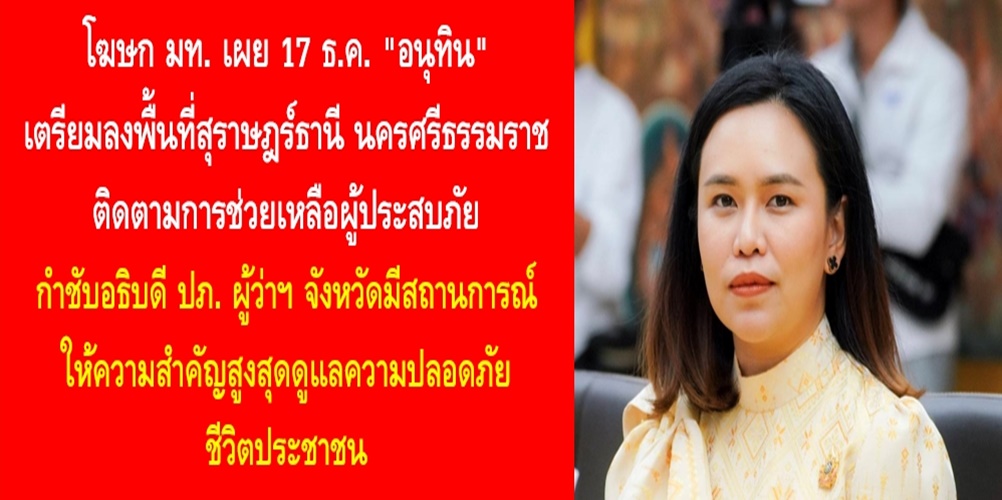 น.ส.ไตรศุลี ไตรสรณกุล เลขานุการ รมว.มหาดไทยและโฆษกกระทรวงมหาดไทย กล่าวว่า จากที่ขณะนี้ได้มีสถานการณ์อุกภัยในพื้นที่ภาคใต้ และนายอนุทิน ชาญวีรกูล รองนายกรัฐมนตรีและรมว.มหาดไทย ได้รับรายงานจากกรมป้องกันและบรรเทาสาธารณภัย (ปภ.) แจ้งว่ามีกรณีประชาชนเสียชีวิตนั้น ด้วยความห่วงใยประชาชนและเจ้าหน้าที่ผู้ปฏิบัติงาน ในวันพรุ่งนี้ (17 ธ.ค. 67) นายอนุทิน จึงมีกำหนดจะนำผู้บริหารกระทรวงมหาดไทย ลงพื้นที่ จ.สุราษฎร์ธานี และ จ.นครศรีธรรมราช เพื่อติดตามการให้ความช่วยเหลือผู้ประสบภัย พร้อมรับฟังปัญหา อุปสรรคในพื้นที่เพื่อพิจารณาให้การสนับสนุนในด้านต่าง ๆ