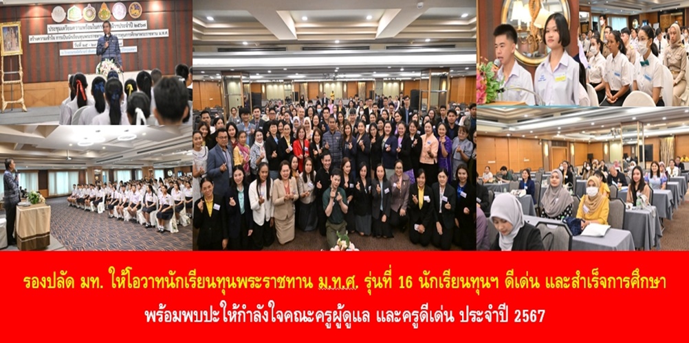 จากนั้น เวลา 10.30 น. นายสันติธร ยิ้มละมัย รองปลัดกระทรวงมหาดไทย ได้พบปะพูดคุยและให้กำลังใจคณะครูผู้ดูแลนักเรียนทุนฯ ม.ท.ศ. รุ่นที่ 16 และครูดีเด่น ประจำปี 2567 โดยกล่าวแสดงความยินดีพร้อมกล่าวขอบคุณในความเสียสละ ความทุ่มเท อุตสาหะ ที่ได้พัฒนานักเรียนทุนฯ ม.ท.ศ. ซึ่งเป็นทรัพยากรที่มีคุณค่าของประเทศ และให้กำลังใจในการปฏิบัติหน้าที่อย่างเต็มกำลังความสามารถต่อไป และเน้นย้ำให้ครูดูแลนักเรียนทุนฯ ม.ท.ศ. อย่างใกล้ชิด หากมีปัญหาหรืออุปสรรค กระทรวงมหาดไทย โดยผู้ว่าราชการจังหวัดทุกจังหวัด ในฐานะประธานกรรมการคัดเลือก คัดสรรผู้รับพระราชทานทุน และประสานงานระดับจังหวัด ยินดีและพร้อมที่จะให้การช่วยเหลือหรือแก้ไขปัญหาทุกเรื่อง