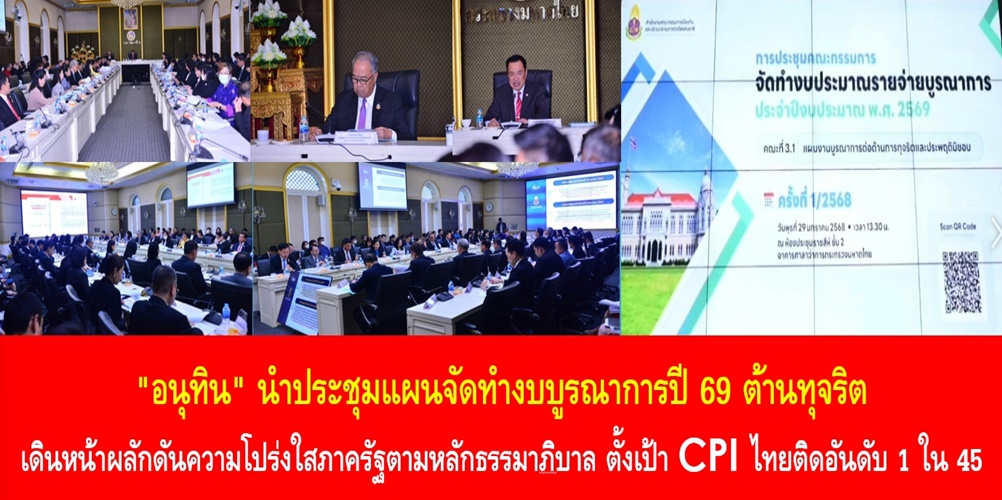 น.ส.ไตรศุลี ไตรสรณกุล เลขานุการ รมว.มหาดไทย และโฆษกกระทรวงมหาดไทย เปิดเผยว่า วันนี้ (29 ม.ค. 68) เวลา 14.00 น. นายอนุทิน ชาญวีรกูล รองนายกรัฐมนตรีและรมว.มหาดไทย (มท.1) เป็นประธานการประชุมคณะกรรมการจัดทำงบประมาณรายจ่ายบูรณาการ ประจำปีงบประมาณ พ.ศ. 2569 คณะที่ 3.1 แผนงานบูรณาการต่อต้านการทุจริตและประพฤติมิชอบ ครั้งที่ 1/2568 โดยมี นายชูศักดิ์ ศิรินิล รัฐมนตรีประจำสำนักนายกรัฐมนตรี ในฐานะรองประธานกรรมการฯ และนายสาโรจน์ พึงรำพรรณ เลขาธิการคณะกรรมการ ป.ป.ช. ในฐานะกรรมการและเลขานุการร่วม ร่วมประชุม ณ ห้องประชุมราชสีห์ ชั้น 2 ศาลาว่าการกระทรวงมหาดไทย