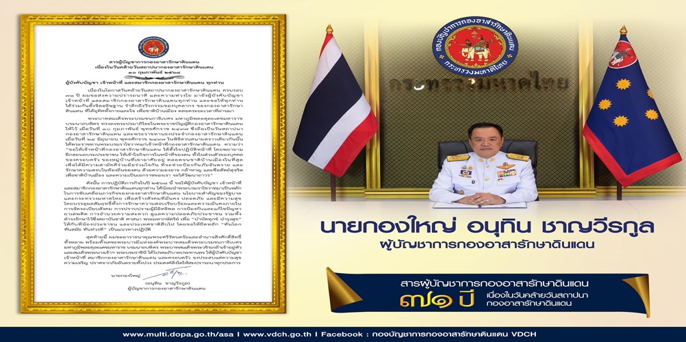 ผู้บังคับบัญชา เจ้าหน้าที่ และสมาชิกกองอาสารักษาดินแดน ทุกท่าน เนื่องในโอกาสวันคล้ายวันสถาปนากองอาสารักษาดินแดน ครบรอบ 71 ปี ผมขอส่งความปรารถนาดี และความห่วงใย มายังผู้บังคับบัญชา เจ้าหน้าที่ และสมาชิกกองอาสารักษาดินแดนทุกท่าน และขอให้ทุกท่าน ได้ร่วมกันตั้งจิตอธิษฐาน รำลึกถึงวีรกรรมของบุคลากร ของกองอาสารักษาดินแดน ที่ได้อุทิศทั้งกายและใจ เพื่อชาติบ้านเมือง ตลอดระยะเวลาที่ผ่านมา