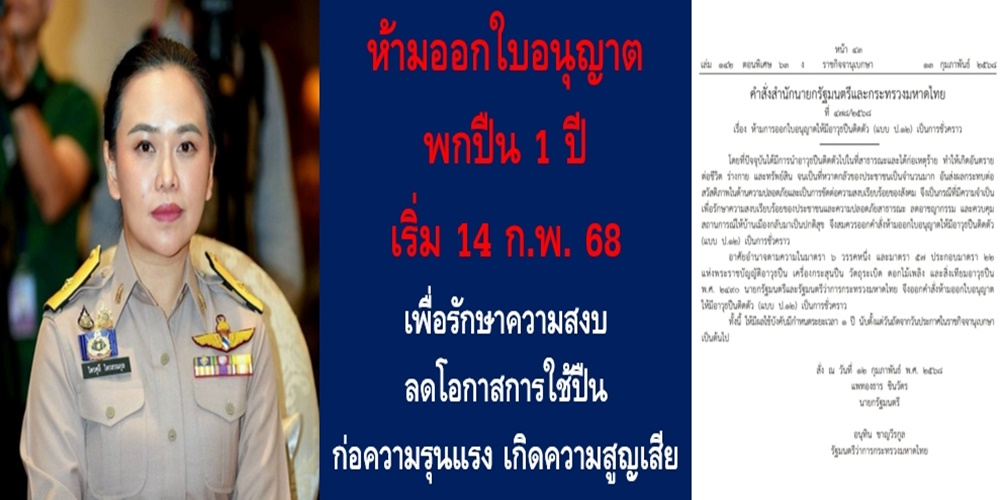 น.ส.ไตรศุลี ไตรสรณกุล เลขานุการ รมว.มหาดไทยและโฆษกกระทรวงมหาดไทย กล่าวว่า เมื่อวันที่ 12 ก.พ. 68 น.ส.แพทองธาร ชินวัตร นายกรัฐมนตรี และนายอนุทิน ชาญวีรกูล รองนายกรัฐมนตรี และ รมว.มหาดไทย ได้ลงนามในคำสั่งสำนักนายกรัฐมนตรีและกระทรวงมหาดไทย ที่ 478/2568 เรื่อง ห้ามการออกใบอนุญาตให้มีอาวุธปืนติดตัว (แบบ ป.12) เป็นการชั่วคราว มีสาระสำคัญเป็นการห้ามไม่ให้เจ้าหน้าที่นายทะเบียนออกใบอนุญาตพกพาอาวุธปืนเป็นเวลา 1 ปี นับแต่วันถัดจากวันประกาศในราชกิจจานุเบกษา