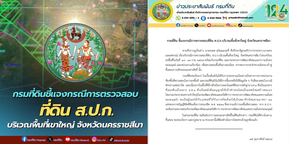 ตามที่ปรากฏเป็นข่าว นายธนดล สุวัณณะฤทธิ์ ที่ปรึกษารัฐมนตรีว่าการกระทรวงเกษตรและสหกรณ์ เกี่ยวกับกรณีการตรวจสอบที่ดิน ส.ป.ก.บริเวณพื้นที่เขาใหญ่ จังหวัดนครราชสีมา โดยเตรียมลงพื้นที่ในวันที่ 18 – 19 ก.พ. 2568 พร้อมกับกรมที่ดิน และกระทรวงการพัฒนาสังคมและความมั่นคง ของมนุษย์ และหน่วยงานเกี่ยวข้อง เพื่อตรวจสอบพื้นที่อย่างละเอียด หากพบการกระทำความผิดจะเข้าสู่ขั้นตอนการเพิกถอนเอกสารสิทธิ์ นั้น