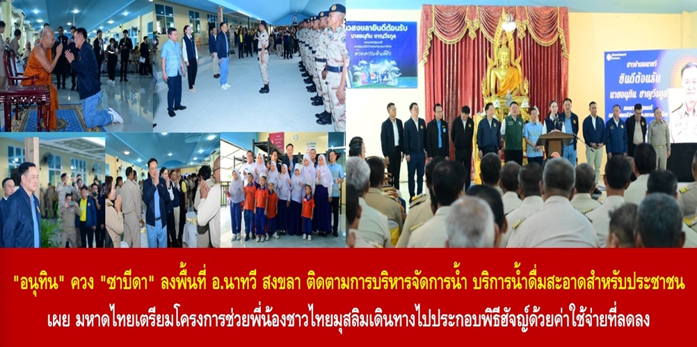 วันนี้ (17 ก.พ. 68) เวลา 14.00 น. ที่วัดนาทวี อ.นาทวี จ.สงขลา นายอนุทิน ชาญวีรกูล รองนายกรัฐมนตรีและรมว.มหาดไทย และ น.ส.ซาบีดา ไทยเศรษฐ์ รมช.มหาดไทย ลงพื้นที่พบปะกำนัน ผู้ใหญ่บ้าน และประชาชน พร้อมตรวจติดตามการบริหารจัดการน้ำ แก้ปัญหาน้ำท่วม น้ำแล้ง ตลอดจนการดูแลให้มีน้ำดื่มสะอาดสำหรับประชาชน ในพื้นที่ จ.สงขลา โดยมี นายอรรษิษฐ์ สัมพันธรัตน์ ปลัดกระทรวงมหาดไทย และคณะผู้บริหารระดับสูง ร่วมลงพื้นที่ โดยได้รับเมตตาจาก พระวชิรสุนทร (สุภัตร อริโย) รองเจ้าคณะจังหวัดสงขลา เจ้าอาวาสวัดนาทวี กล่าวสัมโมทนียกถาต้อนรับ