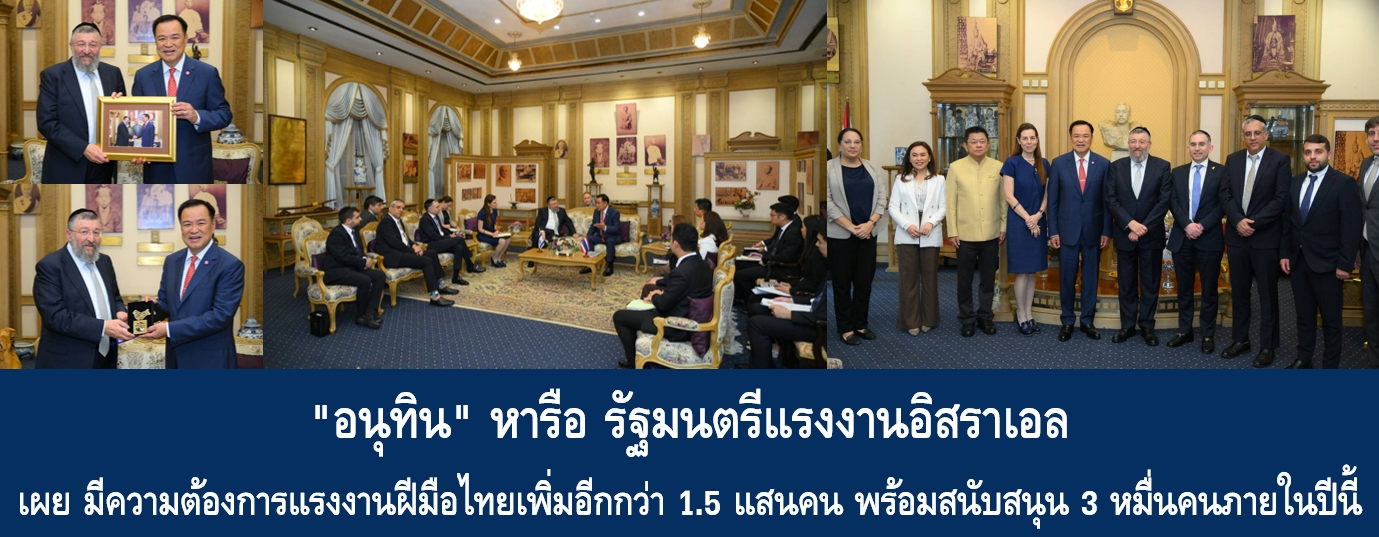 “ปัจจุบันมีแรงงานไทยที่ไปทำงานในประเทศอิสราเอลกว่า 4 หมื่นคน ซึ่งส่วนมากจะเป็นภาคการเกษตร โดยการหารือในวันนี้ถือเป็นโอกาสที่ดีที่ได้ทราบว่าทางประเทศอิสราเอลชื่นชมศักยภาพของแรงงานไทยที่มีความขยัน ละเอียดประณีต หนักเอาเบาสู้ สามารถทดแทนแรงงานของประเทศเพื่อนบ้านได้เป็นอย่างดี จึงทำให้ทางผู้ประกอบการอิสราเอลมีความต้องการจ้างงานแรงงานไทยเพิ่มมากยิ่งขึ้นในภาคอุตสาหกรรมซึ่งต้องใช้ทักษะการทำงานที่สูง” นายอนุทิน กล่าว
