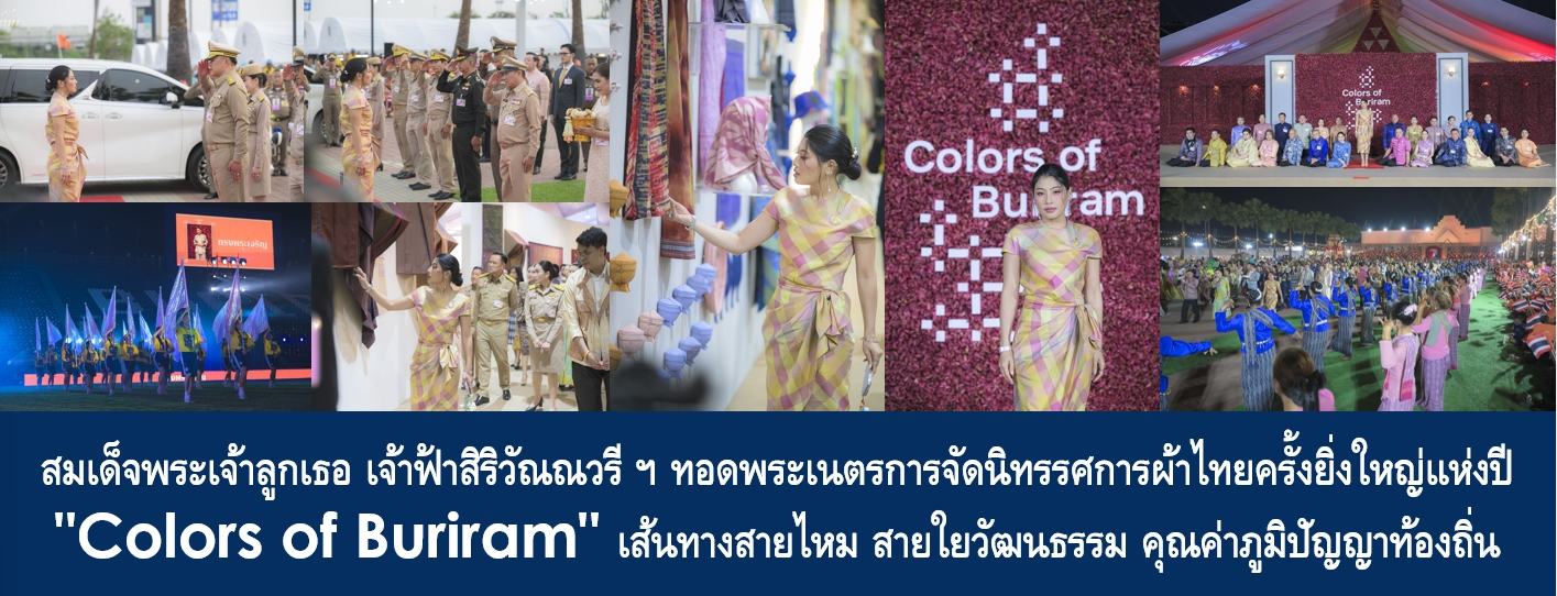 การจัดงานผ้าไทยครั้งยิ่งใหญ่แห่งปี “Colors of Buriram” เพื่อสืบสานและต่อยอด จากโครงการ “ผ้าไทยใส่ให้สนุก” ที่จะนำเสนอผลิตภัณฑ์ผ้าไทยและหัตถกรรมพื้นถิ่นในรูปแบบนิทรรศการที่ทันสมัยและไฮแฟชั่นสุดอลังการ ผ่านนิทรรศการแห่งกาลเวลาที่ถ่ายทอดองค์ความรู้จากเส้นไหม การทอ การสาวไหม และการย้อมผ้าไหม สู่การพัฒนาเป็นเสื้อผ้าไทยประยุกต์ สะท้อนอัตลักษณ์ผ้าไหมเมืองบุรีรัมย์ซึ่งแฝงไว้ด้วยความผูกพันทางสายใยจากรุ่นสู่รุ่น