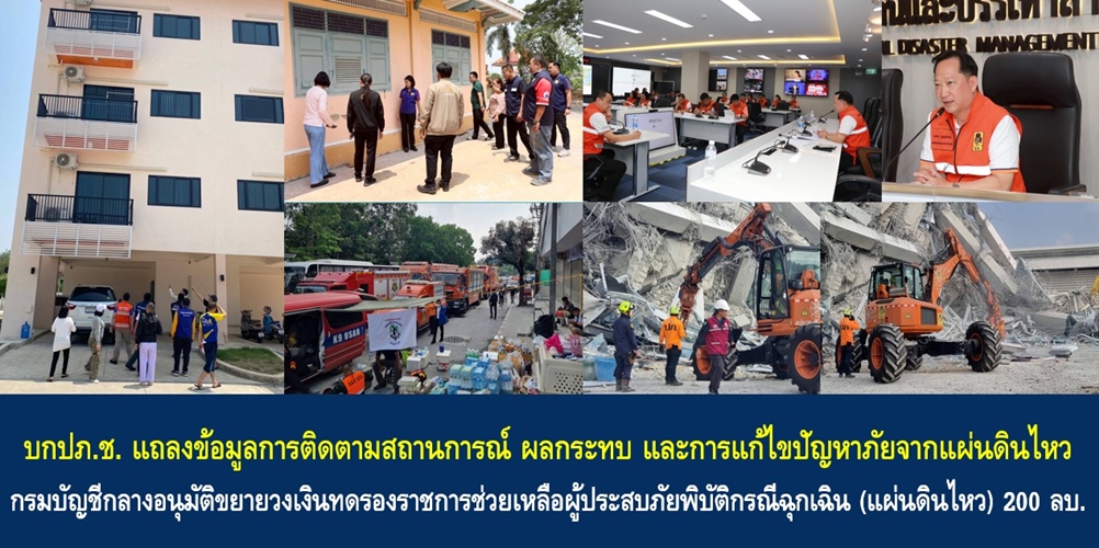 ทั้งนี้ เหตุการณ์แผ่นดินไหวที่เกิดขึ้น มีพื้นที่รับรู้แรงสั่นไหว รวม 57 จังหวัด รวมถึงกรุงเทพมหานคร โดยมี Aftershock ขนาด 2.8 – 7.1 รวม 138 ครั้ง และได้รับรายงานความเสียหายรวม 14 จังหวัด ได้แก่ จังหวัดเชียงใหม่ เชียงราย พะเยา ลำพูน ลำปาง แม่ฮ่องสอน แพร่ เพชรบูรณ์ สุโขทัย พระนครศรีอยุธยา นนทบุรี สมุทรปราการ สมุทรสาคร และจังหวัดชัยนาท รวมถึงกรุงเทพมหานคร ซึ่งเป็นพื้นที่ที่ได้รับผลกระทบรุนแรงมากที่สุด โดยมีผู้เสียชีวิต 8 ราย บาดเจ็บ 9 ราย และสูญหาย 80 ราย โดยในส่วนของความเสียหายด้านที่อยู่อาศัย พบว่า มีบ้านเรือนเสียหาย รวม 89 หลัง อาคาร 36 แห่ง และโครงการก่อสร้าง 14 แห่ง โดยอาคารส่วนใหญ่ได้รับความเสียหายบางส่วน เกิดรอยร้าว และมีเศษซากวัสดุหลุดออกจากผนังอาคาร ปัจจุบันได้มีการประกาศเขตพื้นที่ประสบสาธารณภัย และเขตการให้ความช่วยเหลือผู้ประสบภัยพิบัติกรณีฉุกเฉินแล้ว จำนวน 2 จังหวัด ได้แก่ จังหวัดปทุมธานี และจังหวัดแพร่ อีกทั้งกรุงเทพมหานครได้มีการประกาศเขตพื้นที่ประสบภัยพิบัติเต็มพื้นที่ ซึ่งขณะนี้กรมบัญชีกลางได้อนุมัติให้กรมป้องกันและบรรเทาสาธารณภัยขยายวงเงินทดรองราชการเพื่อให้ความช่วยเหลือผู้ประสบภัยพิบัติกรณีฉุกเฉิน (กรณีแผ่นดินไหว) ในพื้นที่กรุงเทพมหานคร และ 76 จังหวัด ซึ่งเป็นวงเงินในอำนาจของอธิบดีกรมป้องกันและบรรเทาสาธารณภัย จำนวน 200 ล้านบาท สำหรับใช้จ่ายด้านการดำรงชีพและด้านการปฏิบัติงานฯ