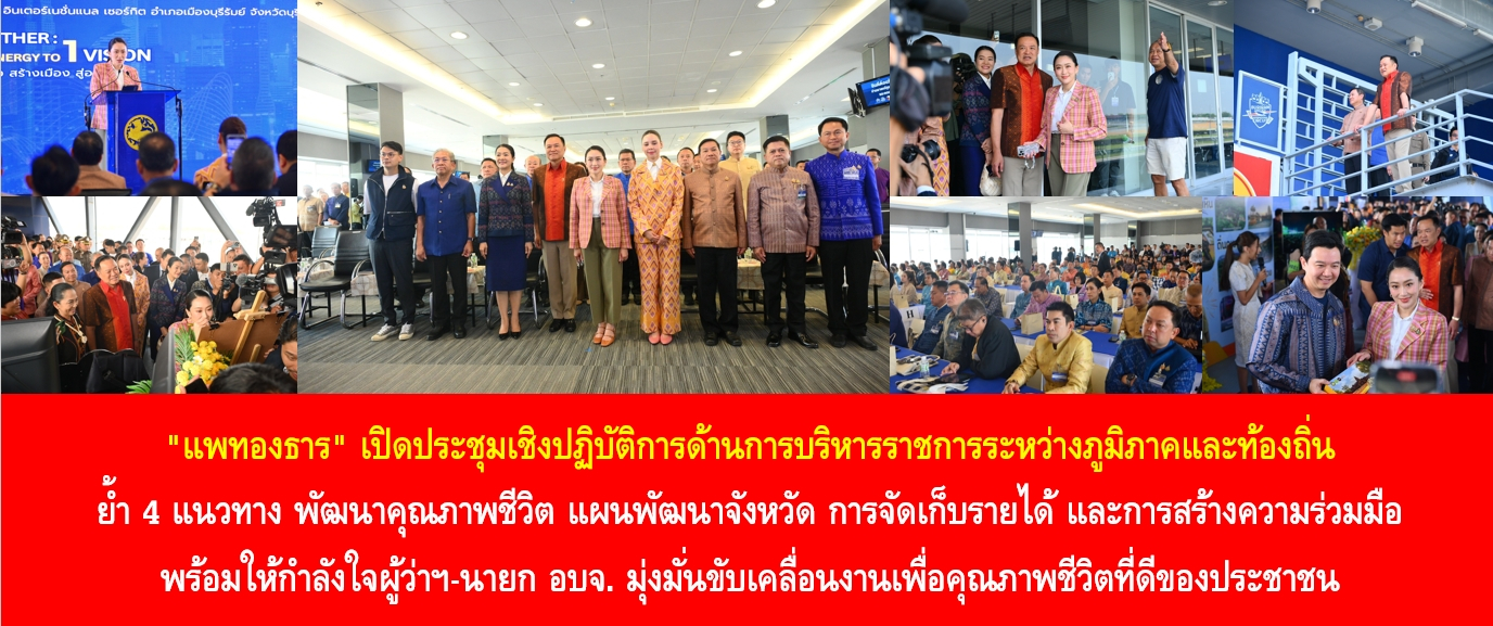 วันนี้ (3 เม.ย. 68) เวลา 09.00 น. น.ส.แพทองธาร ชินวัตร นายกรัฐมนตรี เป็นประธานเปิดโครงการประชุมเชิงปฏิบัติการด้านการบริหารราชการระหว่างภูมิภาคและท้องถิ่น เพื่อบูรณาการขับเคลื่อนการพัฒนาจังหวัด โดยมี นายอนุทิน ชาญวีรกูล รองนายกรัฐมนตรีและรมว.มหาดไทย น.ส.ซาบีดา ไทยเศรษฐ์ รมช.มหาดไทย น.ส.ธีรรัตน์ สำเร็จวาณิชย์ รมช.มหาดไทย นายอรรษิษฐ์ สัมพันธรัตน์ ปลัดกระทรวงมหาดไทย นายนฤชา โฆษาศิวิไลซ์ อธิบดีกรมส่งเสริมการปกครองท้องถิ่น นายปิยะ ปิจนำ ผู้ว่าราชการจังหวัดบุรีรัมย์ พร้อมด้วยผู้บริหารระดับสูงของกระทรวงมหาดไทย ผู้ว่าราชการจังหวัด นายกองค์การบริหารส่วนจังหวัด จากทุกจังหวัด ข้าราชการ และภาคีเครือข่าย ร่วมพิธี ณ สนามช้าง อินเตอร์เนชั่นแนล เซอร์กิต อ.เมืองบุรีรัมย์ จ.บุรีรัมย์