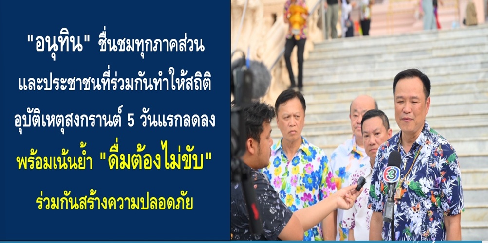 นายอนุทิน กล่าวอีกว่า ปีนี้ ศูนย์อำนวยการความปลอดภัยทางถนน ซึ่งมีกรมป้องกันและบรรเทาสาธารณภัยเป็นฝ่ายเลขานุการ ได้ร่วมกับศูนย์ปฏิบัติการความปลอดภัยทางถนนจังหวัด อำเภอ และองค์กรปกครองส่วนท้องถิ่น เข้มงวดอย่างมาก ทั้งถนนสายหลักและถนนสายรอง ส่งผลให้จำนวนอุบัติเหตุลดลงเป็นอย่างมาก จึงต้องขอขอบพระคุณทุกภาคส่วนและพี่น้องประชาชนที่ได้ให้ความร่วมมือเป็นอย่างดี