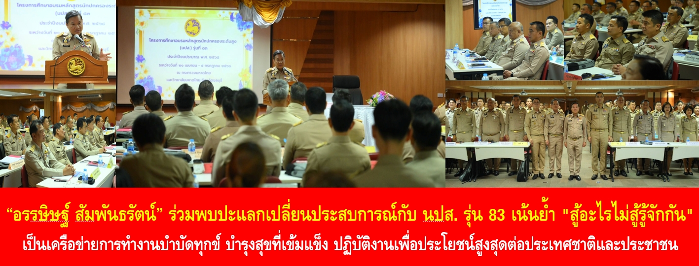 เมื่อวานนี้ (21 เม.ย. 68) เวลา 16.00 น. นายอรรษิษฐ์ สัมพันธรัตน์ ปลัดกระทรวงมหาดไทย พบปะและแลกเปลี่ยนประสบการณ์ให้กับผู้เข้ารับการศึกษาอบรมหลักสูตรนักปกครองระดับสูง (นปส.) รุ่นที่ 83 โดยมี นายเชษฐา โมสิกรัตน์ รองปลัดกระทรวงมหาดไทย นายอัธยา นวลอุทัย ผู้ช่วยปลัดกระทรวงมหาดไทย ร.ต.อ.เขตรัฐ ชาญศิลป์ รองผู้ว่าราชการจังหวัดสมุทรสาคร เข้าร่วมเป็นเกียรติด้วย