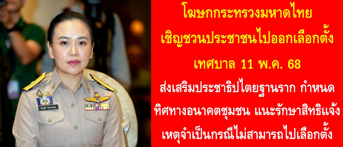 วันนี้ (10 พ.ค. 68) น.ส.ไตรศุลี ไตรสรณกุล เลขานุการ รมว.มหาดไทยและโฆษกกระทรวงมหาดไทย กล่าวว่า ในวันพรุ่งนี้ (11 พ.ค. 68) จะมีการเลือกตั้งนายกเทศมนตรีและสมาชิกสภาเทศบาลทั่วประเทศ (ยกเว้นกรุงเทพมหานคร) จึงขอเชิญชวนพี่น้องประชาชนที่อาศัยอยู่ในเขตเทศบาลและมีสิทธิเลือกตั้ง ไปใช้สิทธิ ที่นอกจากจะเป็นการแสดงการส่วนร่วมกำหนดทิศทางอนาคตชุมชนของตนเองแล้ว ยังเป็นการส่งเสริมประชาธิปไตยระดับฐานรากของประเทศให้เข้มแข็ง