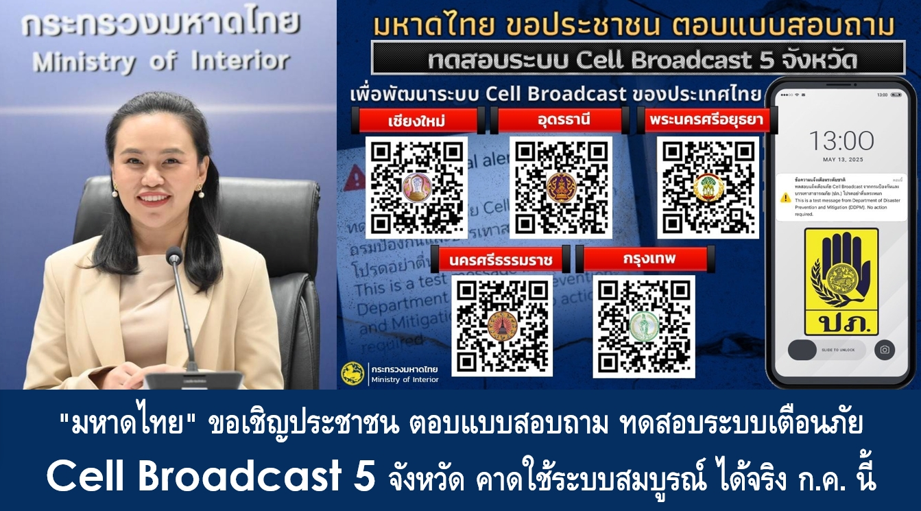 วันนี้ (13 พ.ค. 68) น.ส.ไตรศุลี ไตรสรณกุล เลขานุการ รมว.มหาดไทย และโฆษกกระทรวงมหาดไทย กล่าวว่า ภายหลังจากที่กรมป้องกันและบรรเทาสาธารณภัย (ปภ.)ได้ดำเนินการทดสอบระบบเตือนภัยผ่านสัญญาณโทรศัพท์เคลื่อนที่ หรือ Cell Broadcast ไปแล้ว 3 ครั้ง ประกอบด้วยทดสอบระดับเล็ก เมื่อวันที่ 2 พ.ค. 2568 ทดสอบระดับกลางเมื่อวันที่ 7 พ.ค. 2568 และทดสอบระดับใหญ่ระดับจังหวัดวันนี้ 13 พ.ค.2568 จึงขอความร่วมมือประชาชนที่อาศัยอยู่ในพื้นที่ 5 จังหวัดที่ได้ดำเนินการทดสอบในวันนี้ (13 พ.ค.) ตอบแบบสอบถาม การทดสอบระบบ Cell Broadcast เพื่อนำไปสู่การพัฒนาระบบ Cell Broadcast ของประเทศไทย เพิ่มเติมต่อไปในอนาคตโดยคาดว่าจะสามารถดำเนินการใช้ระบบเตือนภัย ที่สมบูรณ์ได้จริงในช่วงเดือน ก.ค. 68 นี้