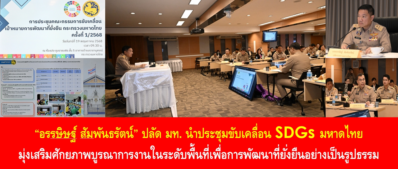 วันนี้ (19 พ.ค. 67) เวลา 09.30 น. นายอรรษิษฐ์ สัมพันธรัตน์ ปลัดกระทรวงมหาดไทย เป็นประธานการประชุมคณะกรรมการขับเคลื่อนเป้าหมายการพัฒนาที่ยั่งยืน (SDGs) กระทรวงมหาดไทย ครั้งที่ 1/2568 โดยมี นายเชษฐา โมสิกรัตน์ รองปลัดกระทรวงมหาดไทย ด้านการบริหาร นายสยาม ศิริมงคล อธิบดีกรมการพัฒนาชุมชน นายศรัณย์ศักด์ ศรีเครือเนตร ผู้ตรวจราชการกระทรวงมหาดไทย นายชัยรัตน์ แก้วเพียงเพ็ญ รองอธิบดีกรมป้องกันและบรรเทาสาธารณภัย นายเสรี กัณฑ์โรจน์ ผู้อำนวยการสำนักนโยบายและแผน น.ส.มัณฑนา สินนะ ผู้เชี่ยวชาญเฉพาะด้านยุทธศาสตร์ สำนักนโยบายและแผน สำนักงานปลัดกระทรวงมหาดไทย ตลอดจนหัวหน้าส่วนราชการ และเจ้าหน้าที่ที่เกี่ยวข้อง ร่วมประชุม ณ ห้องประชุมราชบพิธ ชั้น 5 อาคารดำรงราชานุสรณ์ กระทรวงมหาดไทย