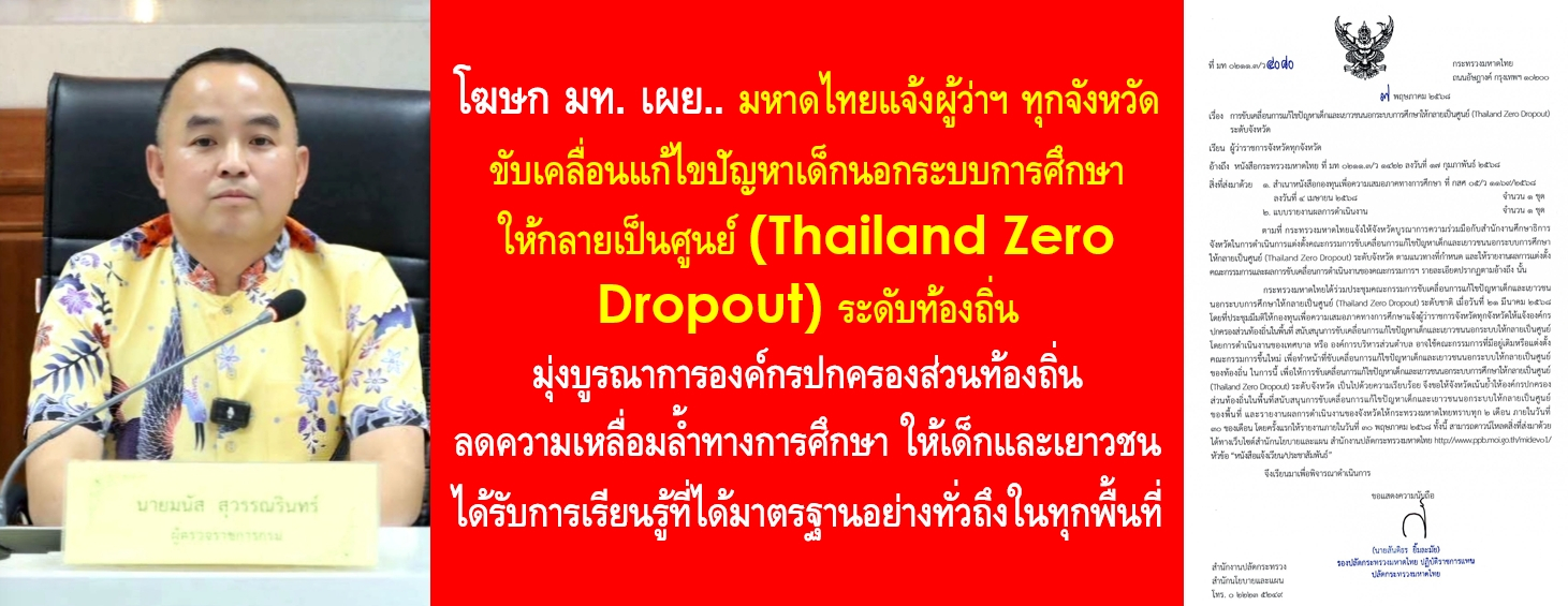 “การส่งเสริมให้เด็กและเยาวชนได้รับการศึกษาหรือพัฒนาศักยภาพตามความถนัดของผู้เรียน เพื่อแก้ไขปัญหาความเหลื่อมล้ำทางการศึกษาและเพื่อการพัฒนาทรัพยากรมนุษย์ของประเทศเป็นอีกหนึ่งในแนวทางการบำบัดทุกข์ บำรุงสุขประชาชนที่กระทรวงมหาดไทยได้ร่วมกับหน่วยงานที่เกี่ยวข้องดำเนินการอย่างต่อเนื่อง อีกทั้งที่ประชุมคณะรัฐมนตรี เมื่อวันที่ 28 พฤษภาคม 2567 ได้มีมติรับทราบมาตรการขับเคลื่อนประเทศไทยเพื่อแก้ปัญหาเด็กและเยาวชนนอกระบบการศึกษาให้กลายเป็นศูนย์ (Thailand Zero Dropout) และนายกรัฐมนตรีได้มีคำสั่งแต่งตั้งคณะกรรมการขับเคลื่อนการแก้ไขปัญหาเด็กและเยาวชนนอกระบบการศึกษาให้กลายเป็นศูนย์ (Thailand Zero Dropout) ระดับชาติ (คกส.) ซึ่งกระทรวงมหาดไทยได้เป็นหนึ่งในคณะกรรมการฯ ดังกล่าว พร้อมทั้งแจ้งให้ผู้ว่าราชการจังหวัดทุกจังหวัด ได้แต่งตั้งคณะกรรมการขับเคลื่อนการแก้ไขปัญหาเด็กและเยาวชนนอกระบบการศึกษากลายเป็นศูนย์ (Thailand Zero Dropout) ระดับจังหวัด เมื่อช่วงเดือนกุมภาพันธ์ 2568 ที่ผ่านมา โดยให้บูรณาการความร่วมมือกับสำนักงานศึกษาธิการจังหวัด”