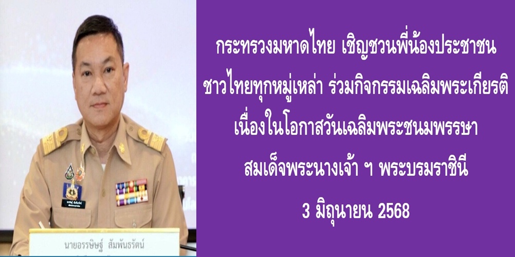นายอรรษิษฐ์ สัมพันธรัตน์ กล่าวเพิ่มเติมว่า ขอเชิญชวนพี่น้องประชาชนชาวไทยทุกหมู่เหล่า ร่วมกิจกรรมเฉลิมพระเกียรติเนื่องในโอกาสวันเฉลิมพระชนมพรรษา สมเด็จพระนางเจ้า ฯ พระบรมราชินี 3 มิถุนายน 2568 ทั้งนี้ สำนักพระราชวัง ได้ประกาศเชิญชวนร่วมลงนามถวายพระพรชัยมงคลผ่านระบบออนไลน์ ที่เว็บไซต์หน่วยราชการในพระองค์ www.royaloffice.th ระหว่างวันที่ 2 – 4 มิถุนายน 2568 เพื่อร่วมกันแสดงออกซึ่งความจงรักภักดีโดยพร้อมเพียงกัน
