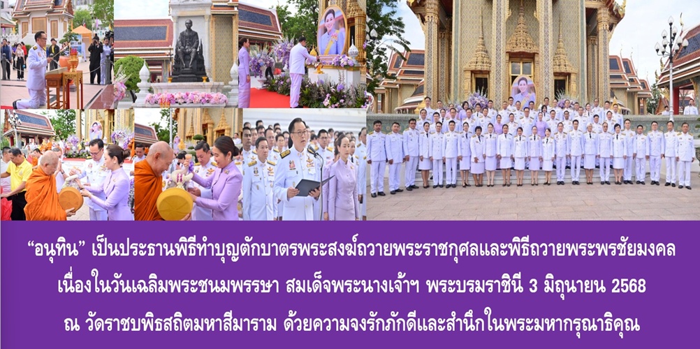 วันที่ (2 มิ.ย. 68) เวลา 07.00 น. นายอนุทิน ชาญวีรกูล รองนายกรัฐมนตรีและรมว.มหาดไทย พร้อมด้วย น.ส.ธนนนท์ นิรามิษ ภริยารองนายกรัฐมนตรีและรมว.มหาดไทยและที่ปรึกษากิตติมศักดิ์สมาคมแม่บ้านมหาดไทย เป็นประธานพิธีทำบุญตักบาตรถวายพระราชกุศลและถวายพระพรชัยมงคล เนื่องในโอกาสวันเฉลิมพระชนมพรรษา สมเด็จพระนางเจ้า ฯ พระบรมราชินี 3 มิถุนายน 2568 โดยได้รับเมตตาจาก เจ้าประคุณสมเด็จพระมหาวีรวงศ์ เลขานุการสมเด็จพระสังฆราช กรรมการมหาเถรสมาคม ผู้ช่วยเจ้าอาวาสวัดราชบพิธสถิตมหาสีมาราม ราชวรวิหาร นำคณะสงฆ์รับบิณฑบาต โดยมี นายทรงศักดิ์ ทองศรี รมช.มหาดไทย นายอรรษิษฐ์ สัมพันธรัตน์ ปลัดกระทรวงมหาดไทย นางจิณณารัชช์ สัมพันธรัตน์ นายกสมาคมแม่บ้านมหาดไทย รองปลัดกระทรวงมหาดไทย อธิบดี ผู้ตรวจราชการกระทรวงมหาดไทย หัวหน้าหน่วยงานรัฐวิสาหกิจในสังกัดกระทรวงมหาดไทย ข้าราชการ พนักงานรัฐวิสาหกิจ เจ้าหน้า และภาคีเครือข่ายกระทรวงมหาดไทย และสมาคมแม่บ้านมหาดไทย ร่วมพิธีอย่างพร้อมเพรียง ณ วัดราชบพิธสถิตมหาสีมาราม ราชวรวิหาร เขตพระนคร กรุงเทพฯ