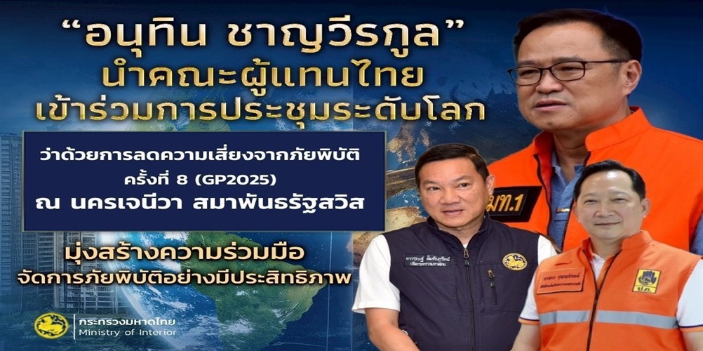 วันนี้ (3 มิ.ย. 68) น.ส.ไตรศุลี ไตรสรณกุล เลขานุการ รมว.มหาดไทยและโฆษกกระทรวงมหาดไทย กล่าวว่า ระหว่างวันที่ 3-6 มิ.ย. 68 นายอนุทิน ชาญวีรกูล รองนายกรัฐมนตรีและ รมว.มหาดไทย จะนำคณะผู้แทนจากประเทศไทย อาทิ นายอรรษิษฐ์ สัมพันธรัตน์ ปลัดกระทรวงมหาดไทยในฐานะรองผู้บัญชาการป้องกันและบรรเทาสาธารณภัยแห่งชาติ และนายภาสกร บุญญลักษม์ อธิบดีกรมป้องกันและบรรเทาสาธารณภัย เข้าร่วมการประชุมระดับโลกว่าด้วยการลดความเสี่ยงจากภัยพิบัติ ครั้งที่ 8 : Global Platform for Disaster Risk Reduction (GP2025) ณ นครเจนีวา สมาพันธรัฐสวิส