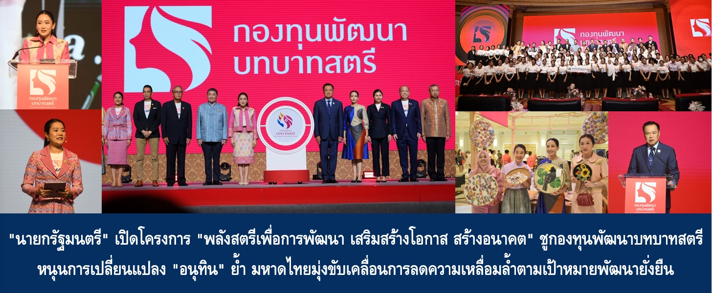 วันนี้ (12 มิ.ย. 68) เวลา 14.00 น. น.ส.แพทองธาร ชินวัตร นายกรัฐมนตรี เป็นประธานเปิดโครงการ “พลังสตรีเพื่อการพัฒนา เสริมสร้างโอกาส สร้างอนาคต” โดยมี นายอนุทิน ชาญวีรกูล รองนายกรัฐมนตรีและรมว.มหาดไทย เป็นผู้กล่าวรายงาน และมีคณะรัฐมนตรี(ครม.) ผู้บริหารกระทรวงมหาดไทย ผู้บริหารส่วนราชการ คณะทูตานุทูต สมาชิกสภาผู้แทนราษฎร สมาคมแม่บ้านมหาดไทย คณะกรรมการกองทุนพัฒนาบทบาทสตรี คณะอนุกรรมการบริหารกองทุนพัฒนาบทบาทสตรี หัวหน้าและคณะทำงานขับเคลื่อนกองทุนพัฒนาบทบาทสตรี ประธานและผู้แทนคณะกรรมการพัฒนาสตรีจังหวัด สมาชิกกลุ่มอาชีพกองทุนพัฒนาบทบาทสตรีที่ประสบความสำเร็จ เจ้าหน้าที่พัฒนาชุมชน รวมทั้งผู้แทนจากภาคเอกชน ภาคประชาสังคม ภาคธุรกิจ และผู้นำสตรีจากภาคีเครือข่ายทั่วประเทศ ร่วมงานมากกว่า 2,000 คน ณ ห้องรอยัล จูบิลี่ อิมแพค เมืองทองธานี อ.ปากเกร็ด จ.นนทบุรี