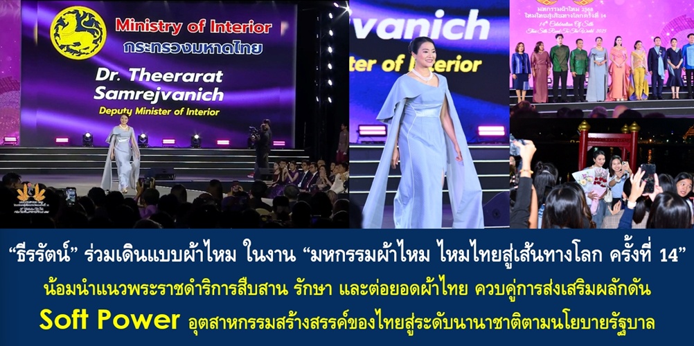 วันนี้ (21 มิ.ย. 68) เวลา 18.00 น. นางสาวธีรรัตน์ สำเร็จวาณิชย์ รัฐมนตรีช่วยว่าการกระทรวงมหาดไทย รักษาราชการแทนรัฐมนตรีว่าการกระทรวงมหาดไทย ร่วมเดินแบบผ้าไหม ในงาน “มหกรรมผ้าไหม ไหมไทยสู่เส้นทางโลก ครั้งที่ 14” ณ หอประชุมกองทัพเรือ แขวงวัดอรุณ เขตบางกอกใหญ่ กรุงเทพฯ โดย นางสาวสุดาวรรณ หวังศุภกิจโกศล รัฐมนตรีว่าการกระทรวงวัฒนธรรม เป็นประธานเปิดงาน โดยมี นายเผ่าภูมิ โรจนสกุล รัฐมนตรีช่วยว่าการกระทรวงการคลัง นายเสริมศักดิ์ พงษ์พานิช อดีตรัฐมนตรีว่าการกระทรวงการท่องเที่ยวและกีฬา นางระเบียบรัตน์ พงษ์พานิช อดีตสมาชิกวุฒิสภา ตลอดจนคณะทูตานุทูต และผู้แทนสถานทูตกว่า 88 ทั่วโลก หัวหน้าส่วนราชการ และภาคีเครือข่าย ร่วมงานเป็นจำนวนมาก
