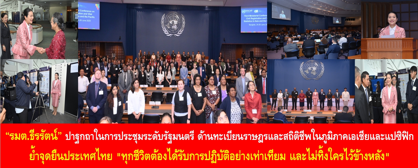 วันนี้ (26 มิ.ย. 68) เวลา 09.00 น. น.ส.ธีรรัตน์ สำเร็จวานิชย์ รัฐมนตรีช่วยว่าการกระทรวงมหาดไทย รักษาราชการแทนรัฐมนตรีว่าการกระทรวงมหาดไทย เป็นประธานปาฐกถาในการประชุมระดับรัฐมนตรี ครั้งที่ 3 ด้านทะเบียนราษฎรและสถิติชีพในภูมิภาคเอเชียและแปซิฟิก (The 3rd Ministerial Conference on Civil Registration and Vital Statistic: CRVS) โดยมี ผู้แทนจากประเทศในภูมิภาค นายวรณัฎฐ์ หนูรอต รักษาการที่ปรึกษาด้านการปกครอง กระทรวงมหาดไทย นายวิฑูรย์ สิรินุกุล รองอธิบดีกรมการปกครอง พร้อมด้วยข้าราชการจากกรมการปกครอง และสำนักงานปลัดกระทรวงมหาดไทยที่เกี่ยวข้องเข้าร่วม ณ ศูนย์การประชุมสหประชาชาติ (UNCC) กรุงเทพมหานคร