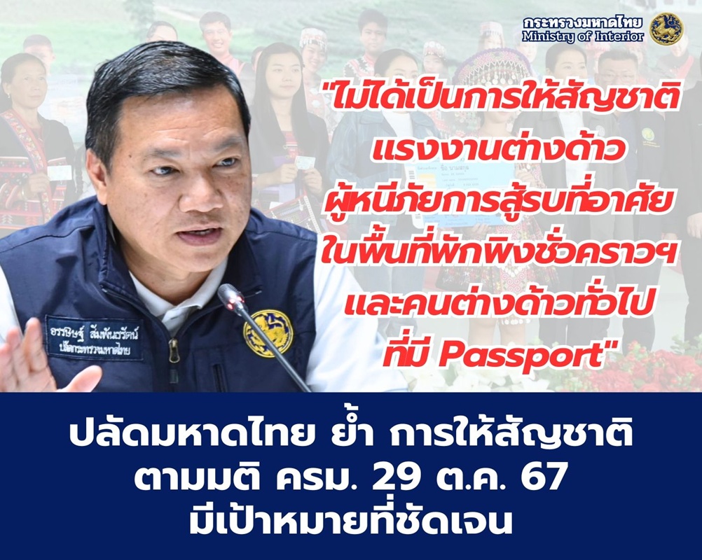นายอรรษิษฐ์ กล่าวว่า การดำเนินการแก้ไขปัญหาสัญชาติตามที่คณะรัฐมนตรี (ครม.) มีมติเห็นชอบ เมื่อวันที่ 29 ต.ค. 67 ในสมัยของนายเศรษฐา ทวีสิน นายกรัฐมนตรีในขณะนั้น ถือเป็นครั้งแรกของประวัติศาสตร์ประเทศไทยที่มีการขับเคลื่อนเร่งรัดแก้ไขเรื่องดังกล่าวอย่างเป็นรูปธรรม กระทั่งได้รับคำชื่นชมจากองค์การระหว่างประเทศและหน่วยงานที่เกี่ยวข้องจำนวนมาก และในขณะนี้รัฐบาลภายใต้การนำของ น.ส.แพทองธาร ชินวัตร นายกรัฐมนตรี ได้เล็งเห็นความสำคัญของการแก้ไขปัญหาอย่างต่อเนื่อง โดยได้สั่งการให้กระทรวงมหาดไทยดำเนินการให้เป็นไปตามขั้นตอนระเบียบกฎหมาย โดยมติ ครม. ดังกล่าว ได้มีการกำหนดกลุ่มเป้าหมายที่ชัดเจน คือ ชนกลุ่มน้อย/กลุ่มชาติพันธุ์ที่อาศัยอยู่ในประเทศไทยมาเป็นเวลานาน และได้รับการจัดทำทะเบียนประวัติและมีข้อมูลในฐานข้อมูลทะเบียนราษฎรไว้แล้ว อาทิ ภาพถ่ายใบหน้า ลายพิมพ์นิ้วมือ ประมาณ 1.4 แสนราย “ไม่ใช่บุคคลต่างด้าวหรือผู้หลบหนีเข้าเมืองแต่อย่างใด”
