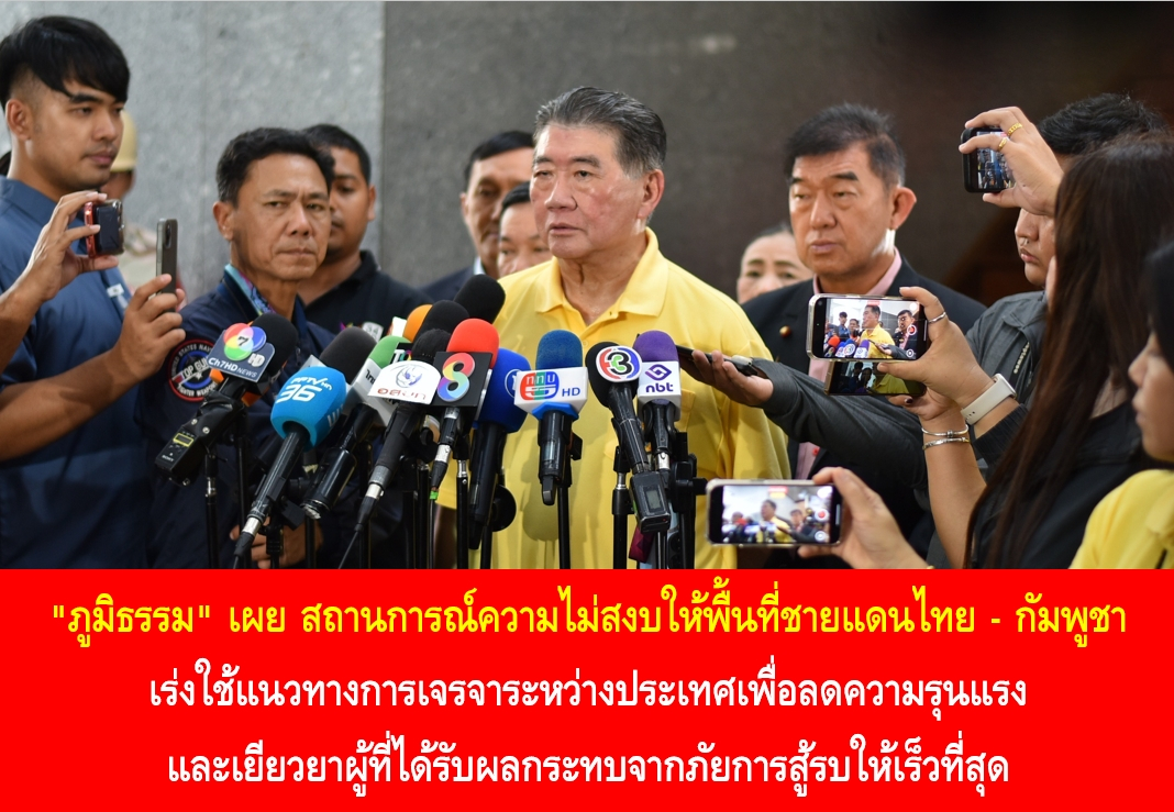 นายภูมิธรรม กล่าวว่า จากสถานการณ์ความรุนแรงในพื้นที่ชายแดนที่ผ่านมา ทางรัฐบาล และกองทัพกำลังเร่งดำเนินการพูดคุยกับทาง นายอันวาร์ อิบราฮิม นายกรัฐมนตรีมาเลเซียและประธานอาเซียน เพื่อที่จะหาแนวทางข้อยุติในการแก้ไขปัญหาให้เร็วที่สุด โดยทางประธานอาเซียนจะได้เข้าสู่ขั้นตอนการเจรจากับนายกรัฐมนตรีของกัมพูชาก่อน เพื่อหาข้อสรุปมาคุยกับทางการไทยเรา สิ่งสำคัญในวันนี้เราจะต้องประณามประเทศกัมพูชาที่เป็นฝ่ายเริ่มต้น การก่อเหตุความรุนแรงก่อน จากการที่ยิงจรวดเข้าสู่เป้าหมายที่เป็นพลเรือน ทำให้ประชาชนคนไทย ได้รับบาดเจ็บและเสียชีวิตเป็นจำนวนมาก ซึ่งผิดหลักกฎหมายระหว่างประเทศอย่างร้ายแรง