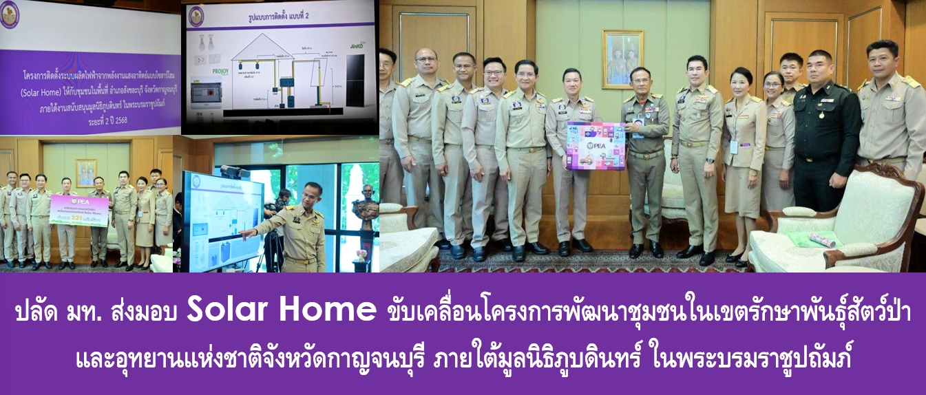 กระทรวงมหาดไทย โดยการไฟฟ้าส่วนภูมิภาค ร่วมบูรณาการขับเคลื่อนโครงการติดตั้งระบบผลิตไฟฟ้าจากพลังงานแสงอาทิตย์แบบโซลาร์โฮม (Solar Home) ซึ่งเป็นระบบผลิตไฟฟ้าจากพลังงานแสงอาทิตย์ที่ติดตั้งในบ้านพักอาศัย เพื่อใช้เป็นแหล่งพลังงานไฟฟ้าสำหรับอุปกรณ์ไฟฟ้าต่าง ๆ ภายในบ้านให้กับประชาชนครัวเรือนในชุมชนพื้นที่โครงการพัฒนาชุมชนในเขตรักษาพันธ์สัตว์ป่าและอุทยานแห่งชาติจังหวัดกาญจนบุรี เพื่อพัฒนาคุณภาพชีวิตของประชาชนทุกครัวเรือนให้ได้มีชีวิตความเป็นอยู่ที่ดีอย่างยั่งยืน โดยในระยะที่ 2 มีแผนดำเนินการปี 2568 พื้นที่อำเภอสังขละบุรี จังหวัดกาญจนบุรี ภายใต้งานสนับสนุนมูลนิธิภูบดินทร์ ในพระบรมรมราชูปถัมภ์ต่อไป
