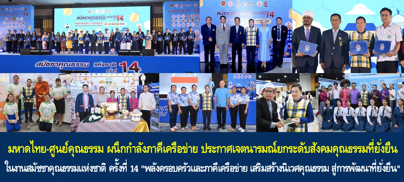 กระทรวงมหาดไทย ร่วมกับศูนย์คุณธรรม (องค์การมหาชน) และภาคีเครือข่ายจากทุกภาคส่วน ร่วมจัด “งานสมัชชาคุณธรรมแห่งชาติ ครั้งที่ 14” ภายใต้แนวคิด “พลังครอบครัวและภาคีเครือข่าย เสริมสร้างนิเวศคุณธรรม สู่การพัฒนาที่ยั่งยืน” เพื่อเป็นเวทีกลางเชื่อมโยงเครือข่ายทางสังคมในการกำหนดทิศทางการขับเคลื่อนคุณธรรม มุ่งสู่การพัฒนาที่ยั่งยืน และสอดคล้องกับยุทธศาสตร์ชาติด้านคุณธรรม ผลักดันข้อเสนอเชิงนโยบายที่ตอบโจทย์สถานการณ์สังคมปัจจุบัน รวมถึงแลกเปลี่ยนเรียนรู้ในรูปแบบ “ชม แชร์ เชียร์” นำเสนอผลงานจากหน่วยงาน ชุมชน องค์กร และภาคีเครือข่ายคุณธรรมในหลากหลายมิติ