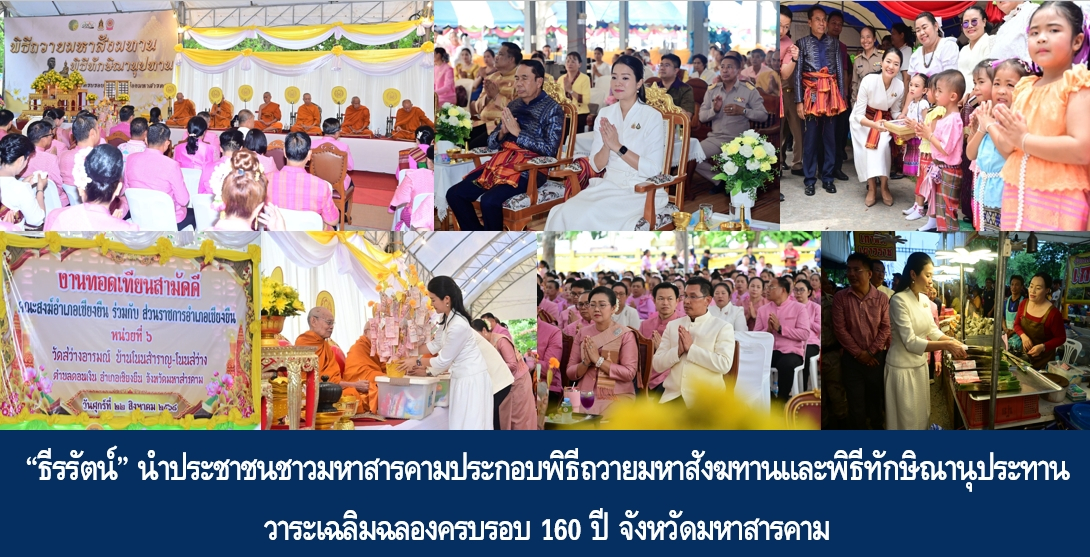 เมื่อวันที่ 22 ก.ค. 68 เวลา 13.30 น. น.ส.ธีรรัตน์ สำเร็จวาณิชย์ รัฐมนตรีช่วยว่าการกระทรวงมหาดไทย เป็นประธานในพิธีถวายมหาสังฆทาน และพิธีทักษิณานุประทาน ณ โดมมหาสังฆทาน หอพระประธานกันทรวิชัย ศาลากลางจังหวัดมหาสารคาม (หลังเก่า) โดยมี พระพรหมวัชรเมธี ที่ปรึกษามหาเถรสมาคม ที่ปรึกษาเจ้าคณะภาค 9 เจ้าอาวาสวัดอรุณราชวราราม ราชวรมหาวิหาร และพระพรหมมุนี ที่ปรึกษาเจ้าคณะภาค 8 เจ้าอาวาสวัดพระศรีมหาธาตุ วรมหาวิหาร เป็นประธานฝ่ายสงฆ์ พร้อมด้วยพระราชวัชรธรรมโสภณ (ศิลา สิริจนฺโท) เจ้าอาวาสวัดพระธาตุหมื่นหิน และคณะสงฆ์ ร่วมประกอบพิธี โดย นายวิบูรณ์ แววบัณฑิต ผู้ว่าราชการจังหวัดมหาสารคาม สมาชิกสภาผู้แทนราษฎร หัวหน้าส่วนราชการ ข้าราชการ พนักงานรัฐวิสาหกิจ ผู้นำท้องที่ ท้องถิ่น ผู้ประกอบการภาคเอกชน และพี่น้องประชาชนชาวจังหวัดมหาสารคาม เข้าร่วมเป็นจำนวนมาก หลังจากนั้น น.ส.ธีรรัตน์ และคณะ ตรวจเยี่ยมและให้กำลังใจผู้ประกอบการ OTOP และเยี่ยมชมมหกรรมหุ่นกระติบข้าวและหุ่นฟางซึ่งจัดบริเวณศาลากลางจังหวัดมหาสารคาม