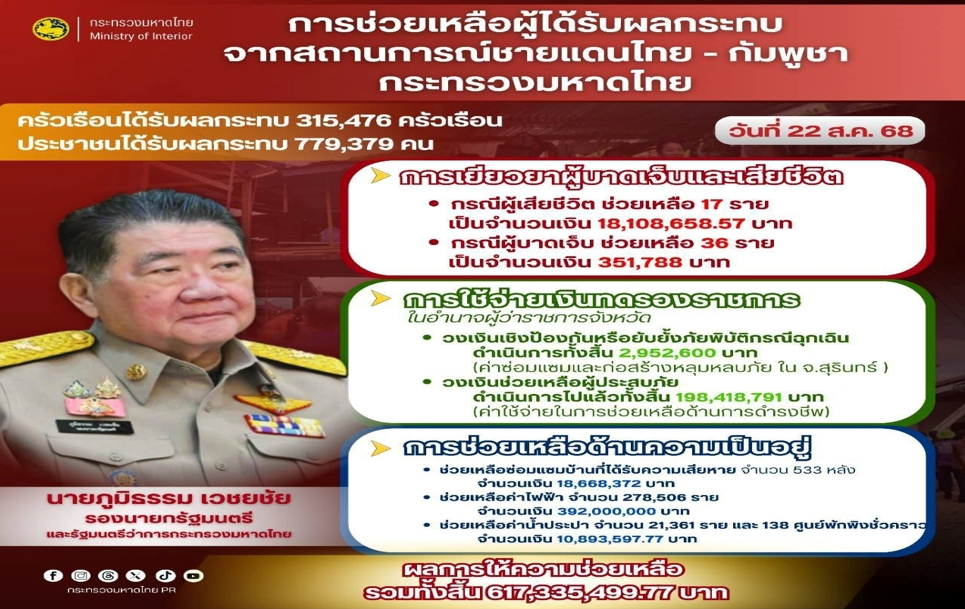 วันนี้ (23 ส.ค. 2568) นายภูมิธรรม เวชยชัย รองนายกรัฐมนตรีและรัฐมนตรีว่าการกระทรวงมหาดไทย รักษาราชการแทนนายกรัฐมนตรี เปิดเผยว่า จากสถานการณ์การสู้รบตามแนวชายแดนไทย – กัมพูชา ซึ่งส่งผลกระทบต่อการดำเนินชีวิตของพี่น้องประชาชน โดยรัฐบาลได้มีการประกาศเขตการให้ความช่วยเหลือผู้ประสบภัยพิบัติกรณีฉุกเฉิน ฯ ในพื้นที่ 7 จังหวัดชายแดน 45 อำเภอ 336 ตำบล 4,081 หมู่บ้าน (จ.อุบลราชธานี ศรีสะเกษ สุรินทร์ บุรีรัมย์ สระแก้ว จันทบุรี และ จ.ตราด) เพื่อให้มีการเบิกจ่ายงบประมาณ ดำเนินการในส่วนต่างๆที่เกี่ยวข้องเพื่อช่วยเหลือเยียวยาประชาชนได้อย่าพงรวดเร็ว และครบถ้วน