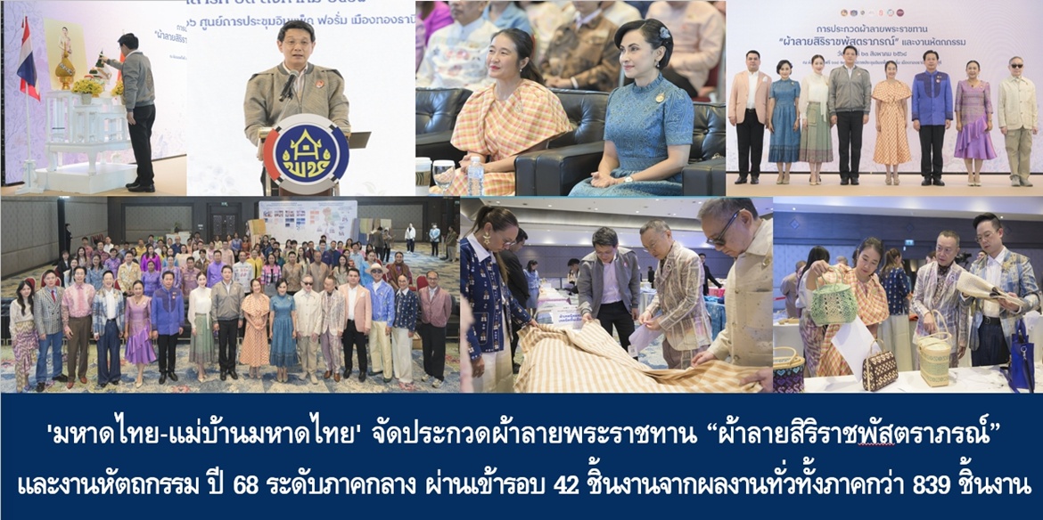 วันที่ 23 ส.ค. 68 เวลา 10.30 น. นายอรรษิษฐ์ สัมพันธรัตน์ ปลัดกระทรวงมหาดไทย มอบหมายให้ นายสยาม ศิริมงคล อธิบดีกรมการพัฒนาชุมชน เป็นประธานเปิดการประกวดและร่วมเป็นกรรมการตัดสิน การประกวดผ้าลายพระราชทาน “ผ้าลายสิริราชพัสตราภรณ์” และงานหัตถกรรม ประจำปี 2568 ระดับภาคกลาง โดยได้รับเกียรติจากนางจิณณารัชช์ สัมพันธรัตน์ นายกสมาคมแม่บ้านมหาดไทย นายเกียรติศักดิ์ ตรงศิริ ผู้ว่าราชการจังหวัดนนทบุรี นางพรศรี ตรงศิริ ประธานแม่บ้านมหาดไทยจังหวัดนนทบุรี นางอรจิรา ศิริมงคล ประธานชมรมแม่บ้านพัฒนาชุมชน พร้อมคณะผู้บริหารกรมการพัฒนาชุมชน คณะกรรมการผู้ทรงคุณวุฒิ คณะที่ปรึกษาโครงการผ้าไทยใส่ให้สนุก ผู้เชี่ยวชาญด้านผ้าไทยและนักออกแบบแถวหน้าของเมืองไทย อาทิ นายธนันท์รัฐ ธนเสฏฐการย์ ดร.ศรินดา จามรมาน นายศิริชัย ทหรานนท์ ผศ. ดร.รวิเทพ มุสิกะปาน ดร.กรกลด คำสุข นายวิชระวิชญ์ อัครสันติสุข นายภูภวิศ กฤตพลนารา นายนุวัฒน์ พรมจันทึก และนายธนาวุฒิ ธนสารวิมล ร่วมพิธีและตัดสินผลงาน ณ ห้องแซฟไฟร์ 204 -206 ศูนย์แสดงสินค้าและการประชุม อิมแพ็ค เมืองทองธานี จังหวัดนนทบุรี