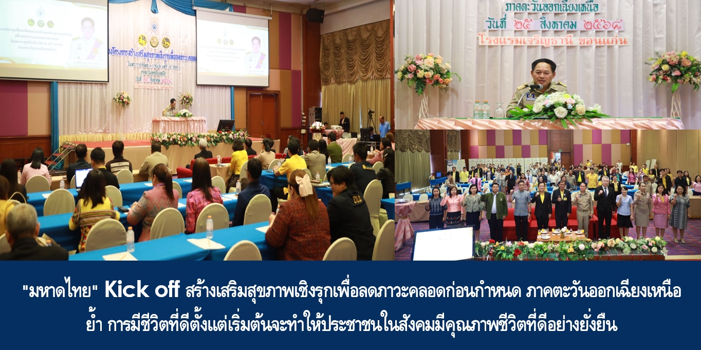วันนี้ (25 ส.ค. 68) เวลา 08.45 น. นายอรรษิษฐ์ สัมพันธรัตน์ ปลัดกระทรวงมหาดไทย มอบหมายให้ นายไกรสร กองฉลาด ผู้ว่าราชการจังหวัดขอนแก่น เป็นประธานเปิดการประชุมชี้แจงโครงการสร้างเสริมสุขภาพเชิงรุกเพื่อลดภาวะคลอดก่อนกำหนด ในพระราชูปถัมภ์สมเด็จพระบรมโอรสาธิราชฯ สยามมกุฎราชกุมาร 4 ภาค (Kick Off 4 ภาค) “ภาคตะวันออกเฉียงเหนือ” ณ ห้องศรีจันทร์ 2 ชั้น 4 โรงแรมเจริญธานี อ.เมืองขอนแก่น จ.ขอนแก่น โดยมี ศ.คลินิกเกียรติคุณ นพ.ธราธิป โคละทัต กรรมการและเลขานุการคณะกรรมการบริหารกองทุนทีปังกรนภัทรบุตร ในพระราชูปถัมภ์ สมเด็จพระบรมโอรสาธิราชฯ สยามมกุฎราชกุมาร นพ.ปกรณ์ ตุงคะเสรีรักษ์ รองอธิบดีกรมอนามัย นางบุณฑริก หิรัญบูรณะ ผู้เชี่ยวชาญเฉพาะด้านนโยบายและยุทธศาสตร์ สำนักนโยบายและแผน สำนักงานปลัดกระทรวงมหาดไทย พร้อมด้วยหัวหน้าส่วนราชการ และภาคีเครือข่าย เข้าร่วม โดยเป็นการถ่ายทอดผ่านระบบ Conference ไปยังศาลากลางจังหวัดกาฬสินธุ์มหาสารคาม หนองคาย ร้อยเอ็ด สกลนคร และจังหวัดศรีสะเกษ โดยมีผู้ว่าราชการจังหวัด รองผู้ว่าราชการจังหวัด หัวหน้าส่วนราชการ และคณะทำงานระดับจังหวัด ระดับอำเภอ ระดับองค์กรปกครองส่วนท้องถิ่น บุคลากรจากสถานีอนามัยเฉลิมพระเกียรติ 60 พรรษานวมินทราชินี โรงพยาบาลส่งเสริมสุขภาพตำบล ตลอดจนเครือข่ายด้านสาธารณสุข ร่วมรับฟัง