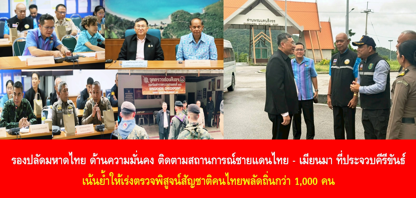 รองปลัดกระทรวงมหาดไทย ได้กำชับเรื่องการแก้ไขปัญหายาเสพติด โดยให้หน่วยงานที่เกี่ยวข้องรายงานผลการปฏิบัติที่บรรลุเป้าหมายตามที่รัฐบาลกำหนดไว้ ให้เป็นรูปธรรมภายใน 3 เดือน เน้นย้ำให้ Re X – Ray ค้นหาผู้ติดผู้เสพยาเสพติด ขยายผลไปถึงผู้ค้า นำตัวผู้เสพเข้าสู่กระบวนการบำบัดรักษา ฟื้นฟู พัฒนาอาชีพ ส่วนพื้นที่ชายแดนของ จ.ประจวบคีรีขันธ์ ซึ่งทุกอำเภอมีพื้นที่ติดกับเมียนมา โดยมีจุดผ่อนปรนพิเศษด่านสิงขร ต.คลองวาฬ อ.เมือง เป็นช่องทางหลักในการข้ามแดน ขอให้เตรียมพร้อมแผนบริหารสถานการณ์ชายแดนที่มีประสิทธิภาพ เพื่อรองรับสถานการณ์ฉุกเฉินที่อาจจะเกิดขึ้น เช่น กรณีชาวเมียนมาอพยพหนีภัยความไม่สงบเข้ามาในฝั่งไทย ต้องมีระบบบริหารจัดการที่มีประสิทธิภาพ เป็นไปตามหลักมนุษยธรรมและสอดคล้องกับการรักษาความมั่นคงของไทย รวมทั้ง ขอให้หน่วยงานที่เกี่ยวข้องเร่งกระบวนการตรวจพิสูจน์สัญชาติคนไทยพลัดถิ่นใน จ.ประจวบคีรีขันธ์ ที่อยู่ระหว่างดำเนินการกว่า 1,000 คน เพื่อให้เป็นไปตามที่คณะกรรมการสิทธิมนุษยชนแห่งชาติ ได้ประสานกระทรวงมหาดไทย ให้เร่งรัดเพื่อคืนสัญชาติให้กับบุคคลกลุ่มนี้ ซึ่งขณะนี้พบว่าทั่วประเทศยังเหลือผู้ที่อยู่ในกระบวนการตรวจพิสูจน์สัญชาติกว่า 4,000 คน