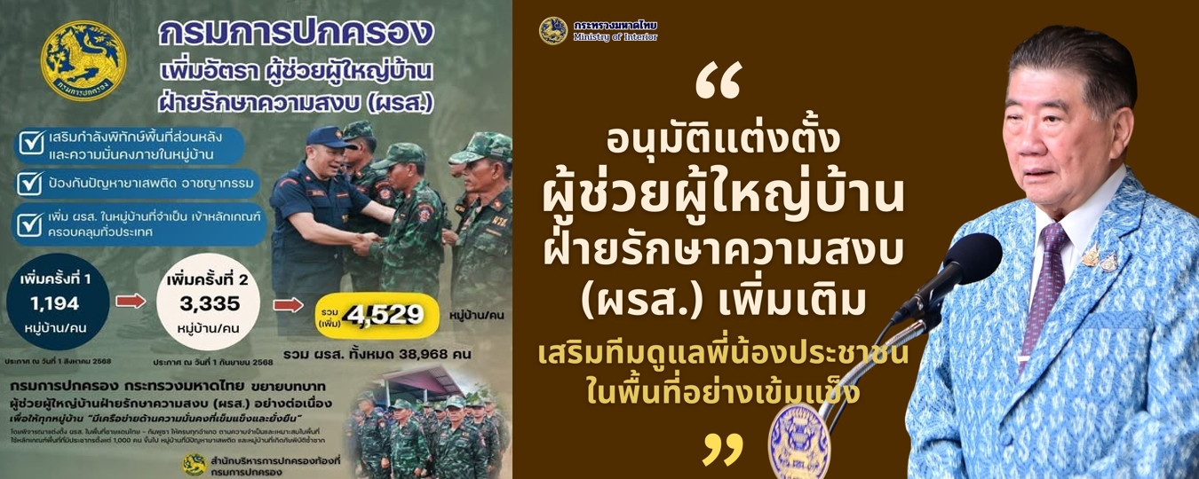 นายภูมิธรรม เวชยชัย รองนายกรัฐมนตรีและรัฐมนตรีว่าการกระทรวงมหาดไทย เปิดเผย ในวันนี้ (2 ก.ย.68) ว่า กระทรวงมหาดไทย ได้เห็นชอบการแต่งตั้งผู้ช่วยผู้ใหญ่บ้านฝ่ายรักษาความสงบ (ผรส.) เพิ่มเติม จำนวน 3,335 หมู่บ้าน (หมู่บ้านละ 1 คน) โดยเน้นหมู่บ้านในพื้นที่ที่เกิดภัยพิบัติบ่อยครั้งและมีความเคลื่อนไหวของผู้ค้าและผู้เสพยาเสพติด รวมถึงหมู่บ้านในอำเภอชายแดนไทย – กัมพูชา ทุกพื้นที่ เพื่อเป็นหลักประกันในการสร้างพื้นที่ทั่วประเทศไทยให้ปลอดภัยสำหรับพี่น้องประชาชนทุกคน ตามนโยบายหลัก “3 ไร้ทุกข์ 5 สร้างสุข หรือ 8 QUICK WINS” ของกระทรวงมหาดไทย
