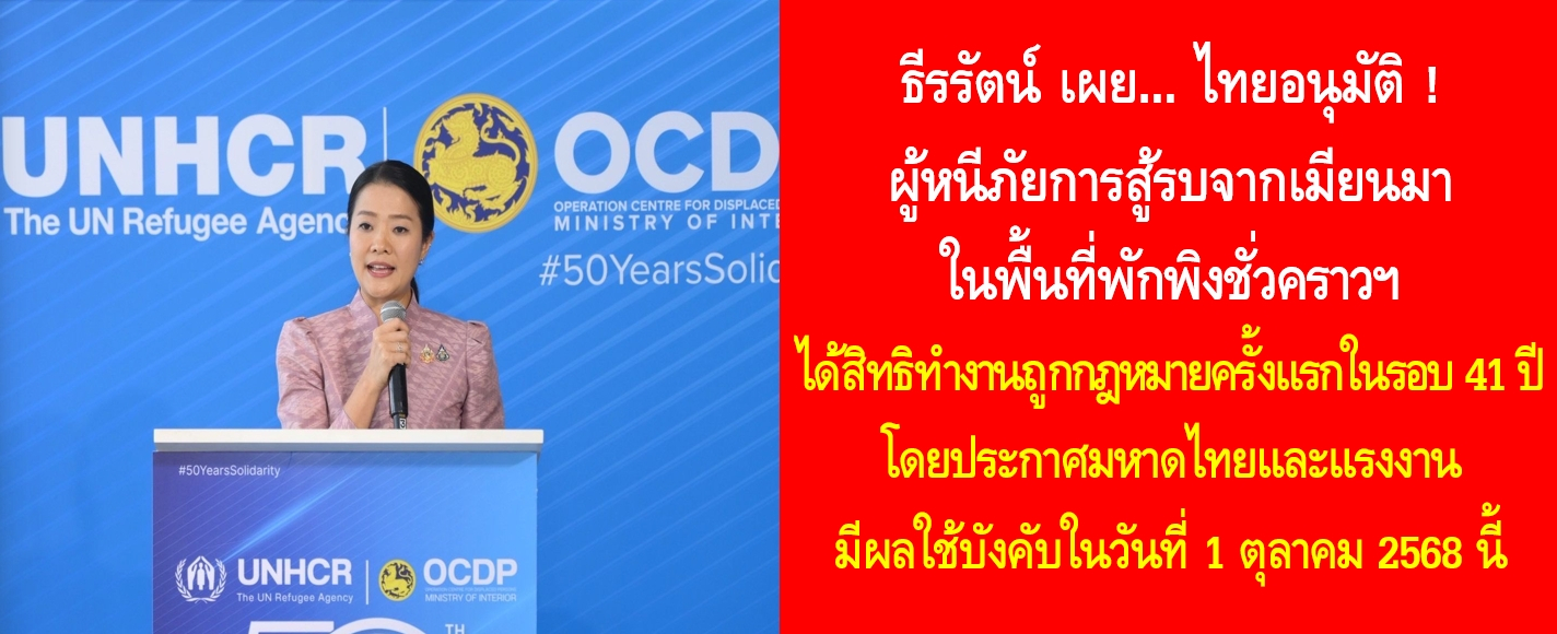 เมื่อวันที่ 9 ก.ย. 68 นางสาวธีรรัตน์ สำเร็จวาณิชย์ รัฐมนตรีช่วยว่าการกระทรวงมหาดไทย กล่าวว่า รัฐบาลไทยประกาศมาตรการสำคัญตามมติคณะรัฐมนตรี เมื่อวันที่ 26 สิงหาคม 2568 อนุญาตให้ผู้หนีภัยการสู้รบจากเมียนมาที่พำนักอยู่ในพื้นที่พักพิงชั่วคราวในราชอาณาจักรมานานกว่า 41 ปี สามารถทำงานได้อย่างถูกต้องตามกฎหมายเป็นครั้งแรก โดยประกาศกระทรวงมหาดไทย และประกาศกระทรวงแรงงาน ซึ่งมีผลใช้บังคับตั้งแต่วันที่ 1 ตุลาคม 2568 เป็นต้นไป