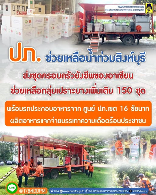 นอกจากนี้ ปภ.ยังได้สนับสนุนรถโรงครัวประกอบอาหารจากศูนย์ป้องกันและบรรเทาสาธารณภัยเขต 16 ชัยนาท จำนวน 1 คัน ประจำไว้ที่่ตำบลชีน้ำร้าย อำเภออินทร์บุรี จังหวัดสิงห์บุรี เพื่อประกอบอาหารแจกจ่ายช่วยเหลือผู้ประสบภัย เพื่อบรรเทาความเดือดร้อนในเบื้องต้น