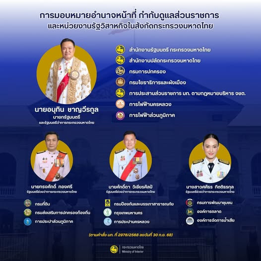 เมื่อวันที่ 30 ก.ย. 68 นายอนุทิน ชาญวีรกูล นายกรัฐมนตรีในฐานะรมว.มหาดไทย ได้ลงนามคำสั่งกระทรวงมหาดไทย ที่ 2976/2568 ลงวันที่ 30 กันยายน 2568 เรื่อง การมอบหมายอำนาจหน้าที่ให้รัฐมนตรีช่วยว่าการกระทรวงมหาดไทย ปฏิบัติราชการแทนรัฐมนตรีว่าการกระทรวงมหาดไทย เพื่อแบ่งมอบภารกิจหน่วยงานในสังกัดกระทรวงมหาดไทย และมอบหมาบให้ รมช.มหาดไทย ทั้ง 3 คน กำกับดูแลส่วนราชการ และหน่วยงานรัฐวิสาหกิจในสังกัดเพื่อประสิทธิภาพการบริหารราชการกระทรวงมหาดไทย มุ่งบำบัดทุกข์ บำรุงสุข ทำให้ประชาชนมีความสมบูรณ์พูนสุข อย่างทันโลก ทันสมัย ทันเหตุการณ์ ทันท่วงที