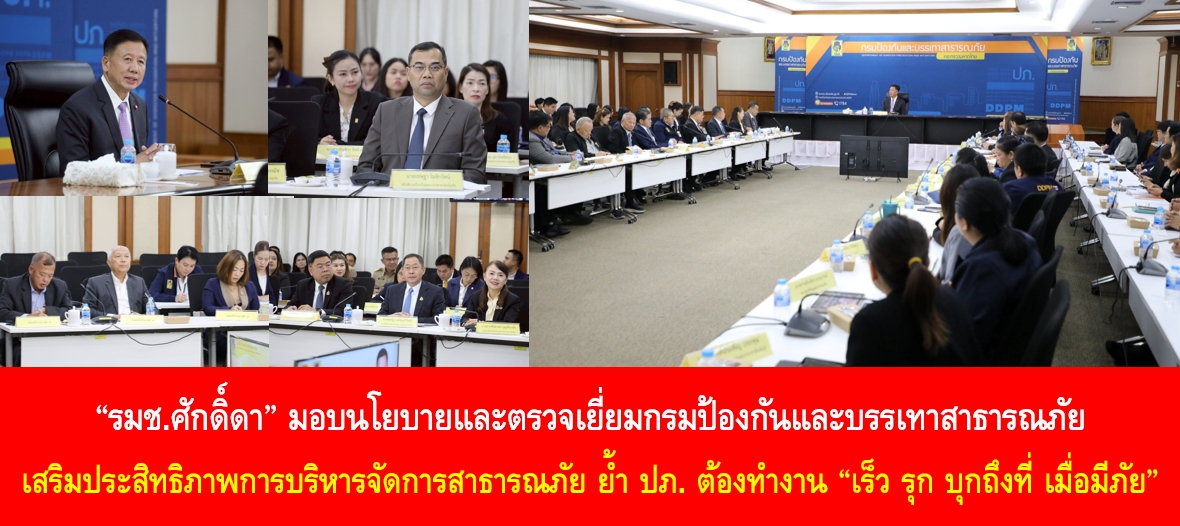 เมื่อวานนี้ (1 ต.ค. 68 เวลา 13.30 น.) ที่ห้องประชุม 1 ปภ. อาคาร 3 ชั้น 5 กรมป้องกันและบรรเทาสาธารณภัย นายศักดิ์ดา วิเชียรศิลป์ รัฐมนตรีช่วยว่าการกระทรวงมหาดไทย มอบนโยบายและตรวจเยี่ยมการปฏิบัติงานของกรมป้องกันและบรรเทาสาธารณภัย ย้ำ ปภ. ต้องทำงานบนหลัก “เร็ว รุก บุกถึงที่ เมื่อมีภัย” การช่วยเหลือเยียวยาต้องรวดเร็ว โดยมีคณะที่ปรึกษารัฐมนตรีช่วยว่าการกระทรวงมหาดไทย พร้อมด้วย นายเชษฐา โมสิกรัตน์ อธิบดีกรมป้องกันและบรรเทาสาธารณภัย นางสาวชัชดาพร บุญพีระณัช นายสหรัฐ วงศ์สกุลวิวัฒน์ นายชัยรัตน์ แก้วเพียงเพ็ญ รองอธิบดีกรมป้องกันและบรรเทาสาธารณภัย ผู้อำนวยการสำนัก/กองส่วนกลาง ผู้อำนวยการศูนย์ป้องกันและบรรเทาสาธารณภัยเขต หัวหน้าสำนักงานป้องกันและบรรเทาสาธารณภัยจังหวัด และจังหวัด สาขา ข้าราชการ และเจ้าหน้าที่ ปภ. เข้าร่วมประชุมฯ และประชุมผ่านสื่ออิเล็กทรอนิกส์
