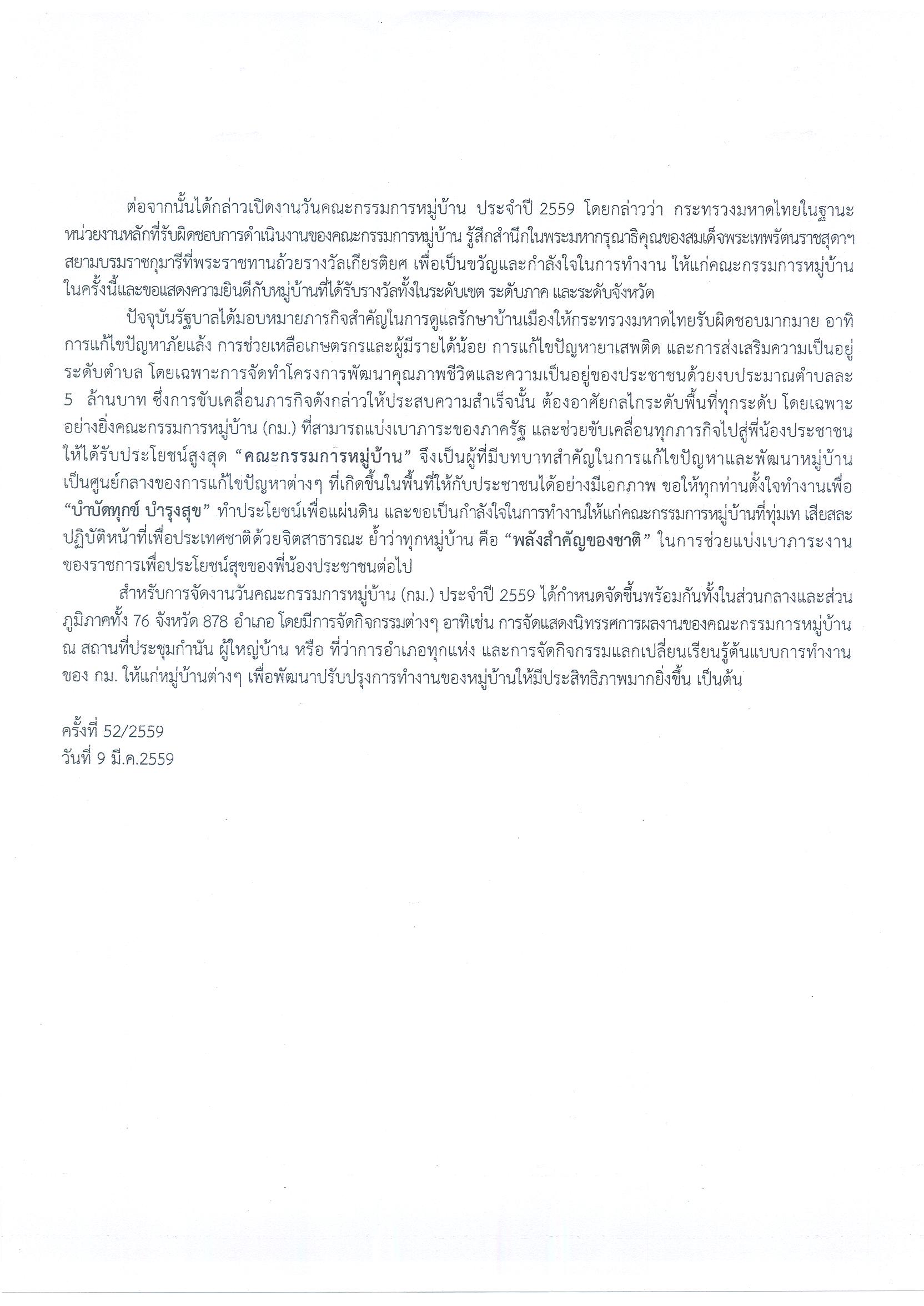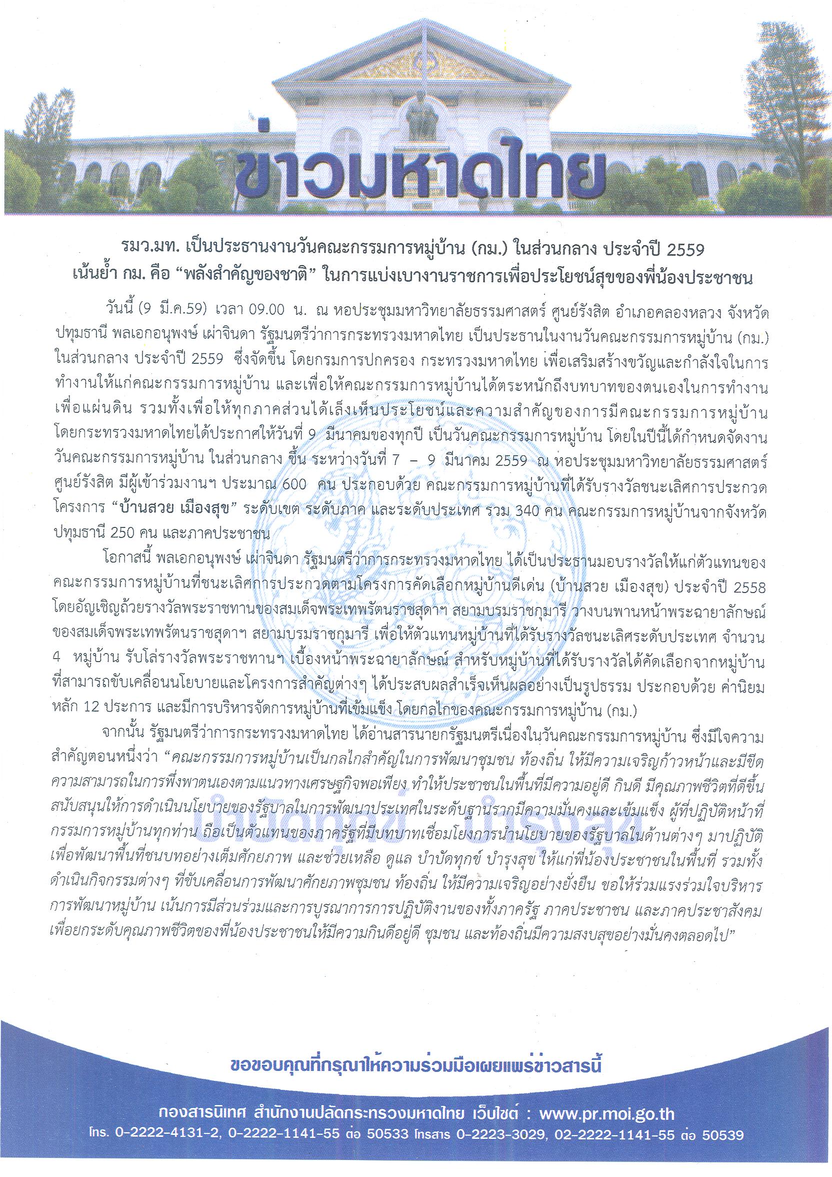 ข่าวมหาดไทย รมว.มท. เป็นประธานงานวันคณะกรรมการหมู่บ้าน (กม.) ในส่วนกลาง ประจำปี 2559 เน้นย้ำ กม. คือ “พลังสำคัญของชาติ” ในการแบ่งเบางานราชการเพื่อประโยชน์สุขของพี่น้องประชาชน โดย กองสารนิเทศ สำนักงานปลัดกระทรวงมหาดไทย 10 มีนาคม 2016 10 มีนาคม 2016 17 ยอดวิว ก่อนหน้า กระทรวงมหาดไทยเดินหน้าวาระ“มหาดไทยใสสะอาด” กำหนด Roadmap ปี 59 เน้นพัฒนาระบบบริหารราชการ สร้างกลไกป้องกันการทุจริตที่เข้มแข็งและส่งเสริมการมีส่วนร่วมของเครือข่ายป้องกันปราบปรามการทุจริตในทุกระดับ ถัดไป กระทรวงมหาดไทยออกหลักเกณฑ์การใช้จ่ายเงินสะสมขององค์กรปกครองส่วนท้องถิ่น เพื่อนำเงินมาใช้กระตุ้นเศรษฐกิจและแก้ไขปัญหาความเดือดร้อนให้กับประชาชนในท้องถิ่นนั้นๆ กำชับให้ใช้จ่ายอย่างมีวินัยทางการเงินการคลัง บทความที่เกี่ยวข้อง “มหาดไทย” ยกระดับเพิ่มประสิทธิภาพการตร... 15 ธันวาคม 2025 “รมช.มท.ก้อย-ศศิธร” แถลงข่าวมหกรรมของข... 15 ธันวาคม 2025 “อรรษิษฐ์ สัมพันธรัตน์” ปลัด มท. ประกา... 15 ธันวาคม 2025 สมเด็จพระกนิษฐาธิราชเจ้า กรมสมเด็จพระเทพรัตนราชสุด... 15 ธันวาคม 2025 มท.4 “ศศิธร” ลงพื้นที่ จ.เชียงใหม่ เปิ... 14 ธันวาคม 2025 “รมช.มท.ศักดิ์ดา” แถลง “ปิดกองบัญชาการ ปภ.ชาติ ส่ว... 14 ธันวาคม 2025 ผู้บัญชาการกองอาสารักษาดินแดน ขอบคุณและชื่นชมความเ... 13 ธันวาคม 2025 “รมช.มหาดไทย ศศิธร” เป็นประธานประชุมรัฐมนตรีอาเซีย... 13 ธันวาคม 2025 คกก.นโยบายลดอุบัติเหตุทางถนนแห่งชาติ เห็นชอบขับเคล... 12 ธันวาคม 2025