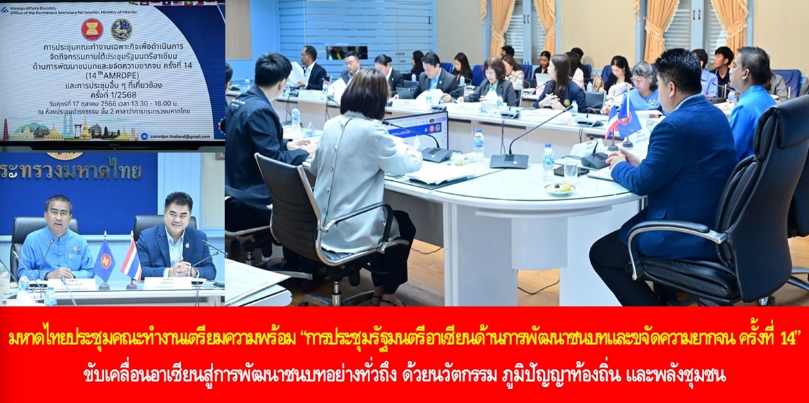 เมื่อวันที่ 17 ตุลาคม 2568 เวลา 13.30 น. ณ ห้องประชุมดำรงธรรม ชั้น 2 ศาลาว่าการกระทรวงมหาดไทย นายสันติธร ยิ้มละมัย รองปลัดกระทรวงมหาดไทย ด้านพัฒนาชุมชนและส่งเสริมการปกครองท้องถิ่น เป็นประธานการประชุมคณะทำงานเฉพาะกิจเพื่อดำเนินการจัดกิจกรรมภายใต้การประชุมรัฐมนตรีอาเซียนด้านการพัฒนาชนบทและขจัดความยากจน ครั้งที่ 14 (14th AMRDPE) โดยมี นายชูชีพ พงษ์ไชย รองปลัดกระทรวงมหาดไทย ด้านบริหาร พร้อมด้วย ข้าราชการ และเจ้าหน้าที่ที่เกี่ยวข้อง เข้าร่วมประชุม
