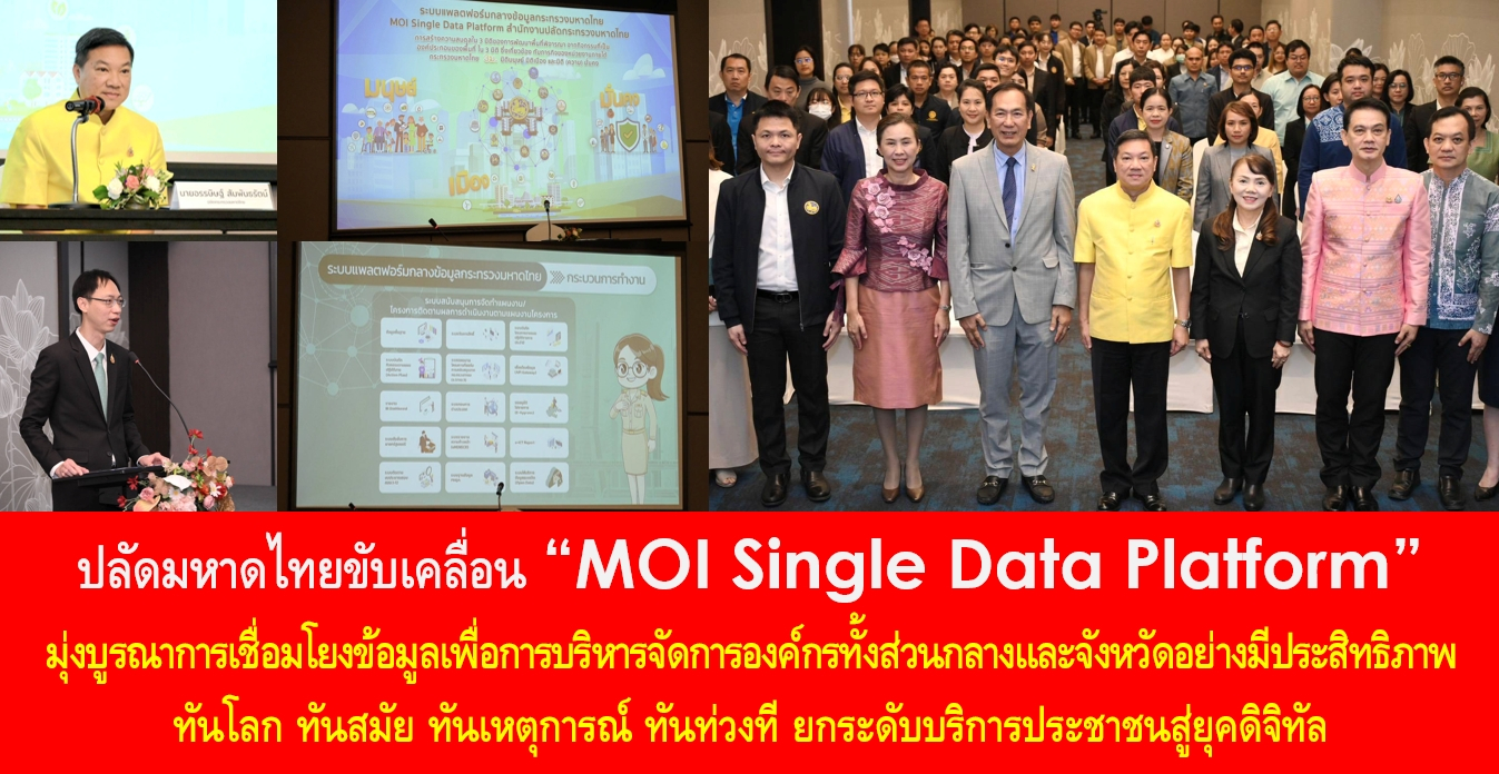 “MOI Single Data Platform จะทำให้ทุกหน่วยงานของกระทรวงมหาดไทย ทั้งกรม รัฐวิสาหกิจ และ 76 จังหวัด สามารถติดตามและประเมินผลการทำงานได้อย่างมีประสิทธิภาพ ผ่านรูปแบบรายงาน BI Dashboard ที่ใช้ได้ทั้งบนคอมพิวเตอร์ แท็บเล็ต และโทรศัพท์มือถือระบบปฏิบัติการ iOS และ Android ซึ่งในปัจจุบันมีการเชื่อมโยงข้อมูลจากหน่วยงานในสังกัดรวม 75 ชุดข้อมูล อาทิ ข้อมูลด้านประชากร ด้านความมั่นคง ด้านเศรษฐกิจฐานราก ด้านสิทธิการถือครองที่ดิน ด้านผังเมือง ด้านสาธารณภัย และข้อมูลสถิติการใช้น้ำประปาและไฟฟ้า เป็นต้น ซึ่งได้นำข้อมูลเหล่านี้มาประมวลผลเพื่อให้บริการในรูปแบบข้อมูลแบบเปิด (Open Data) สอดคล้องตามกฎหมายว่าด้วยการบริหารงานและการให้บริการภาครัฐผ่านระบบดิจิทัล นอกจากนี้ ในด้านการบริหารจัดการองค์กร จะมีระบบปฏิบัติการที่เกี่ยวข้อง เช่น ระบบบันทึกโครงการตามแผนปฏิบัติราชการประจำปีของจังหวัด ระบบบันทึกกิจกรรมตามแผนปฏิบัติงาน (Action Plan) ระบบงานแผนงานโครงการประจำปี (จ.3/กจ.3) ระบบรายงานงบประมาณการแก้ไขปัญหาความเดือดร้อนเร่งด่วนของประชาชน และระบบการขออนุญาตออกนอกเขตจังหวัดและขออนุมัติการเดินทางไปราชการของผู้ว่าราชการจังหวัด (e-Approve) เป็นต้น ทั้งนี้ สำนักงานปลัดกระทรวงมหาดไทย ได้เสริมสร้างความเข้าใจเจ้าหน้าที่ทั้งในส่วนกลางและในแต่ละพื้นที่ในการนำไปใช้ประโยชน์อย่างเป็นรูปธรรม ซึ่งสิ่งเหล่านี้เป็นความมุ่งมั่นตั้งใจของกระทรวงมหาดไทยในการยกระดับประสิทธิภาพการทำงานให้เกิดความทันสมัย ทันโลก ทันท่วงที ทันต่อเหตุการณ์ตามนโยบายของนายกรัฐมนตรี เพื่อนำไปสู่การบริการประชาชนอย่างรุดหน้าต่อไป” นายอรรษิษฐ์ กล่าวเพิ่มเติม