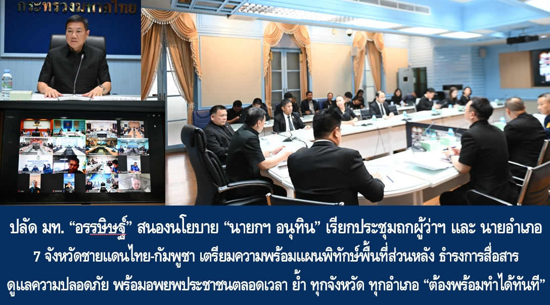 เมื่อวันที่ 12 พ.ย. 68 เวลา 17.10 น. ภายหลังเดินทางกลับจากตรวจสถานการณ์อุทกภัยจังหวัดพระนครศรีอยุธยาร่วมกับนายกรัฐมนตรี “นายอรรษิษฐ์ สัมพันธรัตน์ ปลัดกระทรวงมหาดไทย เป็นประธานประชุมเตรียมการรับมือสถานการณ์บริเวณชายแดนไทย – กัมพูชา ในพื้นที่ 7 จังหวัดชายแดนไทย-กัมพูชา” โดยมี นายพรพจน์ เพ็ญพาส รองปลัดกระทรวงมหาดไทย หัวหน้ากลุ่มภารกิจด้านกิจการความมั่นคงภายใน นายชูชีพ พงษ์ไชย รองปลัดกระทรวงมหาดไทย ด้านบริหาร นายบุญช่วย หอมยามเย็น รักษาการในตำแหน่งที่ปรึกษาด้านความมั่นคง นายอัธยา นวลอุทัย ผู้ช่วยปลัดกระทรวงมหาดไทย ร่วมประชุม ณ ห้องประชุมดำรงธรรม ชั้น 2 อาคารศาลาว่าการกระทรวงมหาดไทย โดย นายนิรัตน์ พงษ์สิทธิถาวร อธิบดีกรมการปกครอง พร้อมด้วยผู้ว่าราชการจังหวัดบุรีรัมย์ สุรินทร์ ศรีสะเกษ อุบลราชธานี จันทบุรี ตราด และสระแก้ว รวมถึงหน่วยเฉพาะกิจนาวิกโยธินจันทบุรี ร่วมประชุมผ่านระบบ Video Conference
