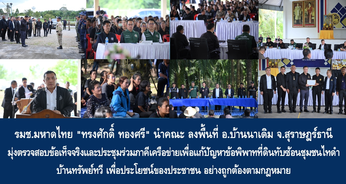 วันนี้ (15 พ.ย. 68) เวลา 13.30 น. ที่ศาลาประชาร่วมใจ เทิดไท้องค์ราชัน หมู่ที่ 1 บ้านควนท่าแร่ ต.ทรัพย์ทวี อ.บ้านนาเดิม จ.สุราษฎร์ธานี นายทรงศักดิ์ ทองศรี รัฐมนตรีช่วยว่าการกระทรวงมหาดไทย ในฐานะประธานคณะอนุกรรมการแก้ไขปัญหาที่ดินสาธารณะประโยชน์ ที่ดินเอกชนปล่อยทิ้งร้าง และปัญหาที่อยู่ในความรับผิดชอบของกระทรวงมหาดไทย ลงพื้นที่ประชุมร่วมกับภาคีเครือข่ายเพื่อแก้ไขปัญหากรณีข้อพิพาทที่ดินทับซ้อนกับพื้นที่ชุมชนไทดำ บ้านทรัพย์ทวี อ.บ้านนาเดิม จ.สุราษฎร์ธานี โดยมี นายจุมพฏ วรรณฉัตรสิริ ผู้ว่าราชการจังหวัดสุราษฎร์ธานี นายบันดาล สถิรชวาล รองผู้ว่าราชการจังหวัดสุราษฎร์ธานี นายขวัญชัย อรัญเวช ผู้อำนวยการสำนักจัดการที่ดินของรัฐ กรมที่ดิน พร้อมคณะอนุกรรมการฯ หัวหน้าส่วนราชการ นายยืนยง คิดถูก นายอำเภอบ้านนาเดิม นายธานินท์ นวลวัฒน์ สมาชิกสภาผู้แทนราษฎรจังหวัดสุราษฎร์ธานี กำนัน ผู้ใหญ่บ้าน และประชาชนในพื้นที่ เข้าร่วมเป็นจำนวนมาก
