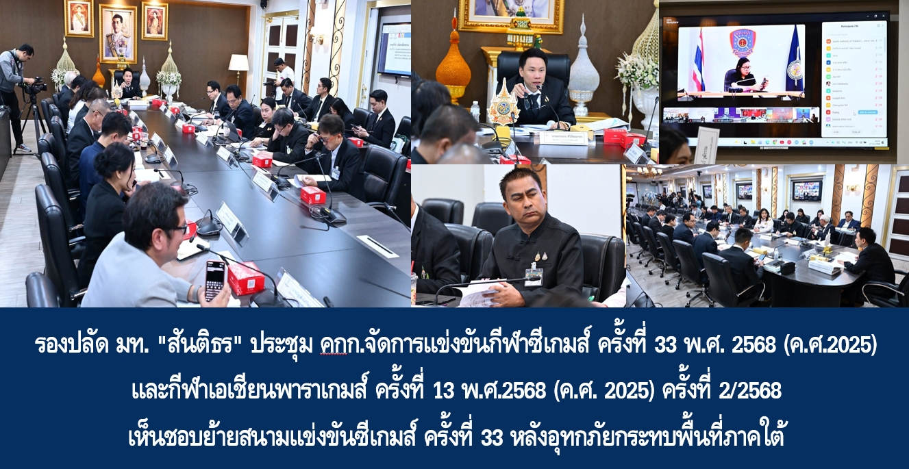 วานนี้ (27 พ.ย. 68) เวลา 15.00 น. นายสันติธร ยิ้มละมัย รองปลัดกระทรวงมหาดไทย หัวหน้ากลุ่มภารกิจด้านพัฒนาชุมชนและส่งเสริมการปกครองท้องถิ่น ได้รับมอบหมายจากนายอรรษิษฐ์ สัมพันธรัตน์ ปลัดกระทรวงมหาดไทย ร่วมประชุมคณะกรรมการจัดการแข่งขันกีฬาซีเกมส์ ครั้งที่ 33 พ.ศ. 2568 (ค.ศ.2025) และกีฬาเอเชียนพาราเกมส์ ครั้งที่ 13 พ.ศ.2568 (ค.ศ. 2025) ครั้งที่ 2/2568 โดยมี นายอรรถกร ศิริลัทธยากร รัฐมนตรีว่าการกระทรวงการท่องเที่ยวและกีฬา เป็นประธานการประชุม ณ ห้องประชุม 109 ชั้น 1 อาคารสำนักงานปลัดสำนักนายกรัฐมนตรี ทำเนียบรัฐบาล โดยมีผู้บริหารจากการกีฬาแห่งประเทศไทย สมาคมกีฬาแห่งชาติ ผู้แทนกองทุนพัฒนาการกีฬาแห่งชาติ และหน่วยงานที่เกี่ยวข้องร่วมประชุม พร้อมเชื่อมต่อผ่านระบบวิดีโอคอนเฟอเรนซ์