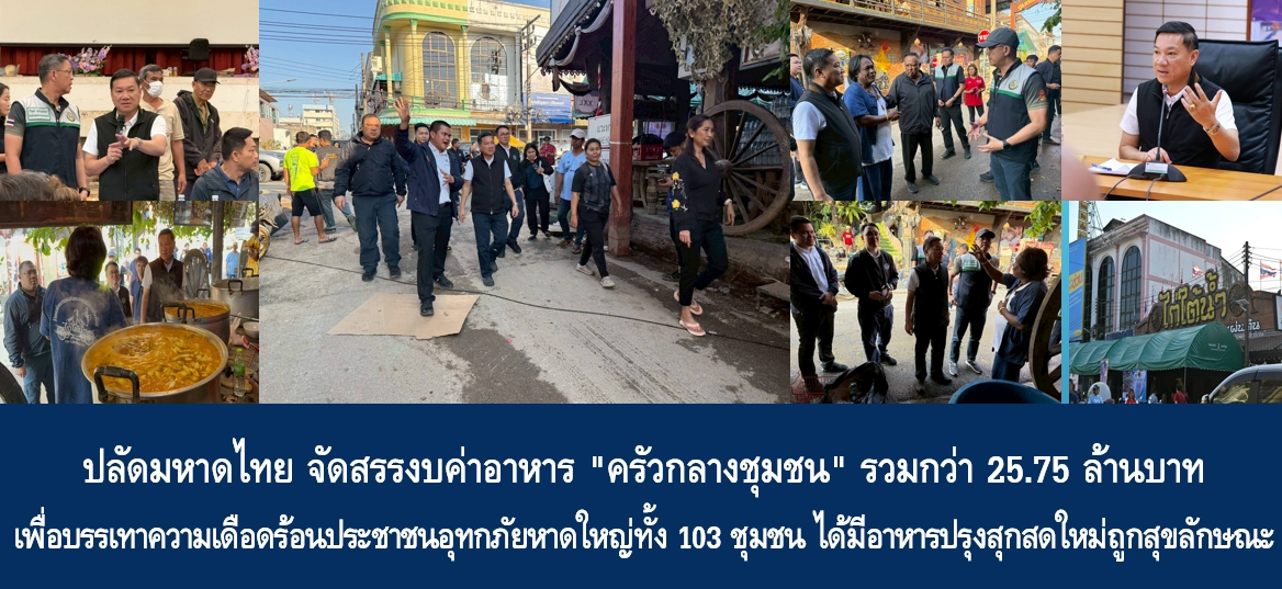 “จากการลงพื้นที่ติดตามการฟื้นฟูสถานการณ์อุทกภัยของนายอนุทิน ชาญวีรกูล นายกรัฐมนตรีและรัฐมนตรีว่าการกระทรวงมหาดไทย เมื่อวานนี้ (30 พ.ย. 68) ได้มีบัญชาให้กระทรวงมหาดไทยเร่งจัดสรรงบประมาณค่าอาหาร “ครัวกลางชุมชน” ในพื้นที่ 103 ชุมชน ๆ ละ 50,000 บาท/วัน จำนวน 5 วัน รวมเป็นเงิน 25,750,000 บาท เพื่อให้ประชาชนได้มีอาหารปรุงสุกใหม่ ถูกสุขลักษณะ เพียงพอต่อการบริโภค ซึ่งในวันนี้ กระทรวงมหาดไทยได้จัดสรรงบประมาณให้กับชุมชนครบทั้ง 103 ชุมชนแล้ว”