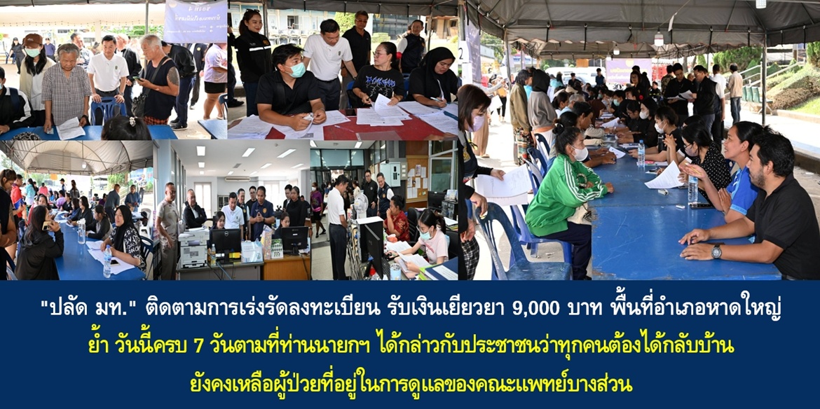 ทั้งนี้ ภายหลังจากติดตามการลงทะเบียนเยียวยาประชาชนที่สำนักงานเทศบาลนครหาดใหญ่แล้ว ปลัดกระทรวงมหาดไทยได้เดินทางต่อไปยัง ที่ว่าการอำเภอหาดใหญ่ และเทศบาลเมืองบ้านพรุ อ.หาดใหญ่ จ.สงขลา เพื่อติดตามเร่งรัดการคีย์ข้อมูลลงระบบรับเงินเยียวยาประชาชนที่ประสบอุทกภัย