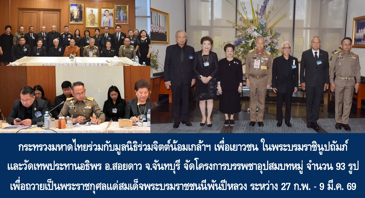 มูลนิธิร่วมจิตต์น้อมเกล้าฯ เพื่อเยาวชน ในพระบรมราชินูปถัมภ์ ร่วมกับวัดเทพประทานอธิพร อำเภอสอยดาว จังหวัดจันทบุรี และกระทรวงมหาดไทย จัดกิจกรรมโครงการบรรพชาอุปสมบทหมู่ จำนวน 93 รูป เพื่อถวายเป็นพระราชกุศลแด่สมเด็จพระนางเจ้าสิริกิติ์ พระบรมราชินีนาถ พระบรมราชชนนีพันปีหลวง โดยมีกำหนดจัดขึ้นระหว่างวันที่ 27 กุมภาพันธ์ ถึงวันที่ 9 มีนาคม 2569 เพื่อสืบสานขนบธรรมเนียมประเพณีอันดีงามของไทย เปิดโอกาสให้พุทธศาสนิกชนชายที่มีอายุ 20 ปีขึ้นไป ได้เข้าสู่ร่มกาสาวพัสตร์ ศึกษาและปฏิบัติธรรมตามหลักพระธรรมวินัย อันเป็นการฝึกฝนขัดเกลาจิตใจ ก่อให้เกิดประโยชน์ทั้งต่อตนเอง ครอบครัว สังคม และประเทศชาติ นอกจากนี้ โครงการยังมีเป้าหมายเพื่อแสดงความกตัญญูกตเวที น้อมสำนึกในพระมหากรุณาธิคุณ และถวายพระราชกุศลแด่สมเด็จพระนางเจ้าสิริกิติ์ฯ ผู้ทรงอุปถัมภ์ค้ำจุนพระพุทธศาสนาอย่างต่อเนื่อง และทรงเป็นแบบอย่างแห่งความศรัทธาของพสกนิกรไทยมาโดยตลอด